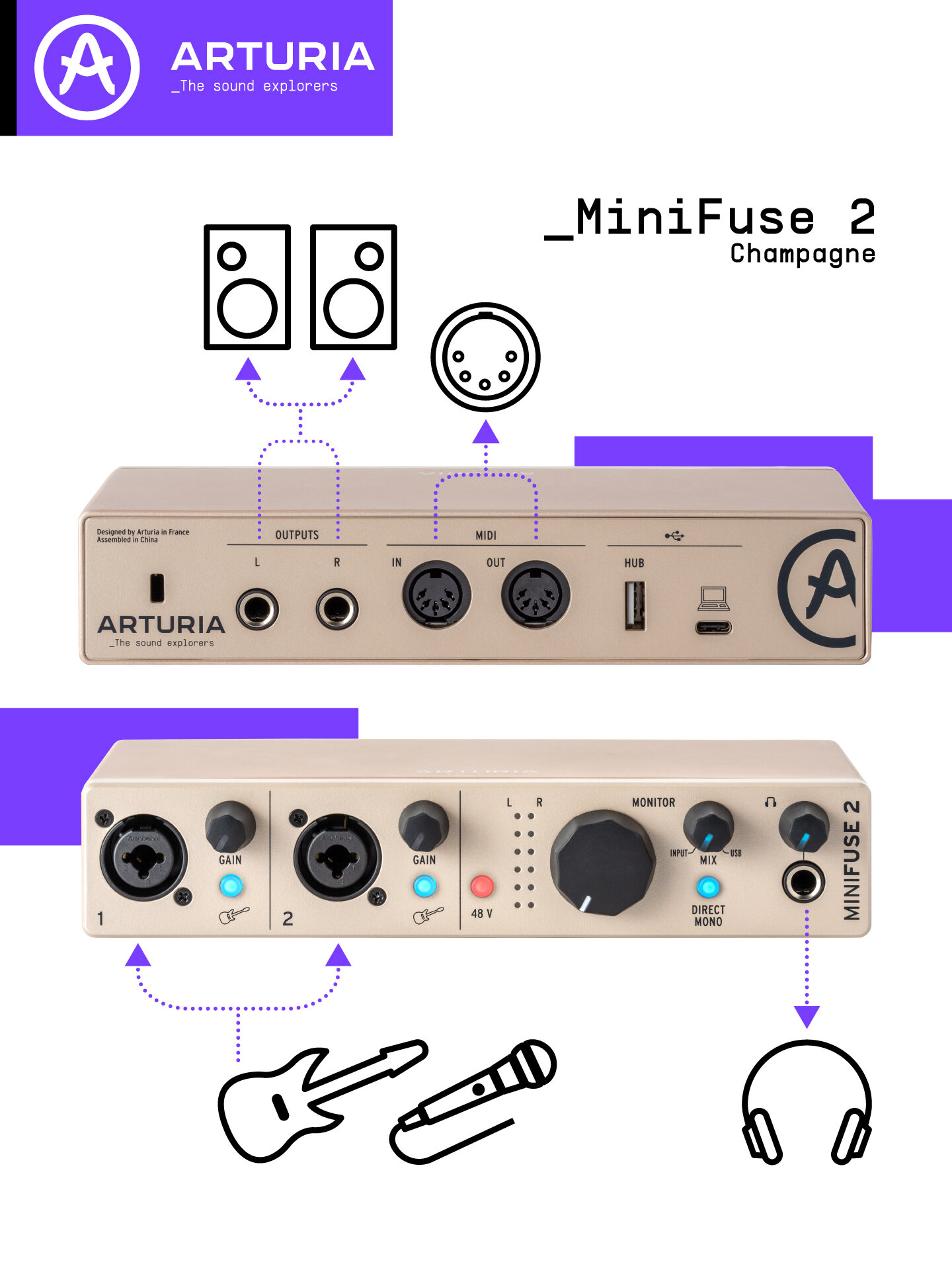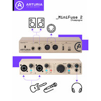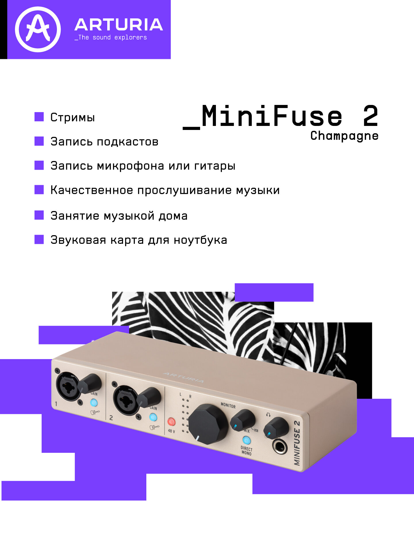 Arturia MiniFuse 2 - компактный 2-канальный USB-C аудиоинтерфейс, лимитированное издание в цвете Champagne. Комбинированный вход позволяет легко подключать кабели с разъемами XLR или 1/4 дюйма. Подключите к компьютеру с помощью быстрой и компактной совместимости с USB-C. Подключите USB-устройства, такие как MIDI-клавиатура, к дополнительному разъему USB-концентратора. MiniFuse может похвастаться динамическим диапазоном 110 дБ и лучшим в своем классе эквивалентным входным шумом -129 дБ. Каждая ваша запись будет звучать невероятно, с богатой динамикой, чистым бесшумным сигналом и студийным качеством. MiniFuse работает с ПК и Mac. С помощью приложения MiniFuse Control Center вы можете отслеживать его входы, выходы, настройки и обновления прошивки в одном месте. Интерфейс работает от шины USB-C. Интерфейс имеет виртуальный канал обратной связи, который отлично подходит для записи телефонных звонков или игрового звука. Также имеется 5-контактный MIDI-вход и MIDI-выход. В комплекте также поставляется пакет ПО, включающий Ableton Live Lite, Arturia Analog Lab Intro, Arturia FX, Native Instruments Guitar Rig 6 LE и бесплатную трехмесячную подписку на Auto-Tune Unlimited и Splice.