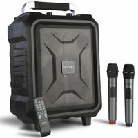 - В комплекте с акустикой идут два беспроводных микрофона, что позволяет использовать устройство для караоке-вечеринок или проведения мероприятий с живым вокалом.