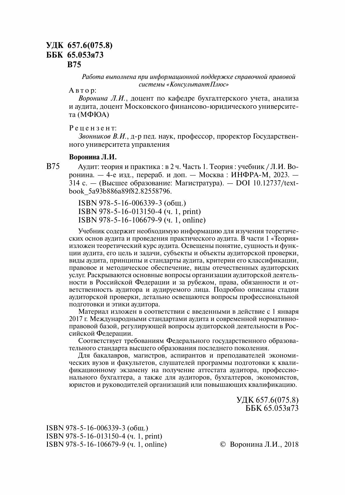 Аудит: теория и практика. В 2 частях Часть 1: Уч./Воронина Л. И, — 4-е изд.-М: НИЦ ИНФРА-М,2026.-314 с.(Переплет 7БЦ): сравнение цен, характеристики, фото, актуальное наличие и цены.