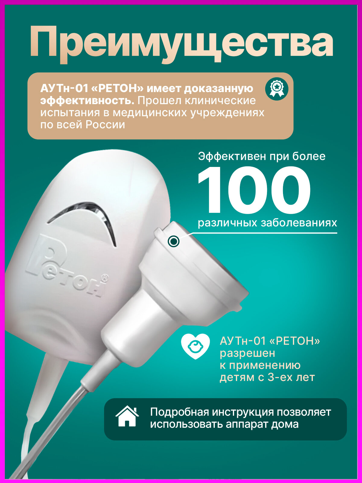| Способ применения | Прежде, чем приступить к лечению аппаратом «Ретон» тех или иных заболеваний, Вам следует проконсультироваться с Вашим лечащим врачом для уточнения диагноза и выявления возможных противопоказаний. Только лечащий врач может откорректировать методику лечения и сделать соответствующее назначение. |