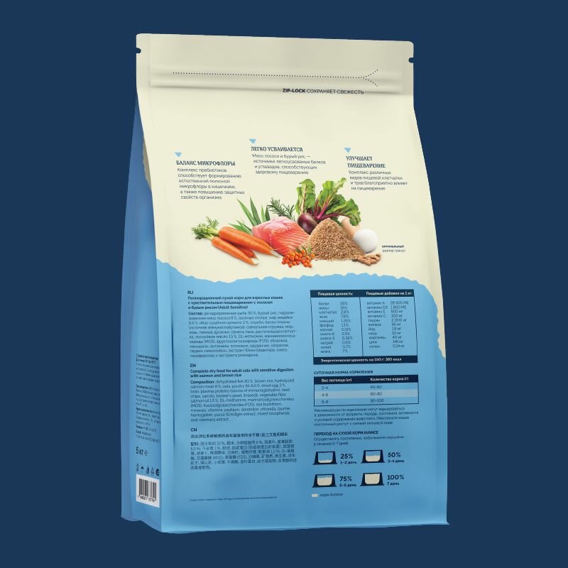 рис, гидролизованное мясо лосося 8%, овсяные хлопья, жир индейки 8,5%, яйцо сушеное цельное 2%, отруби, белки плазмы (источник иммуноглобулинов), свекольная стружка, морковь, пивные дрожжи, семена льна, растительная клетчатка, лососевое масло 1,5%, DL-метионин, маннаноолигосахариды (MOS), фруктоолигосахариды (FOS), облепиха, минералы, витамины, псиллиум, одуванчик, хлорелла, таурин, гемоглобин, экстракт юкки Шидигера, смесь токоферолов и экстракта розмарина.