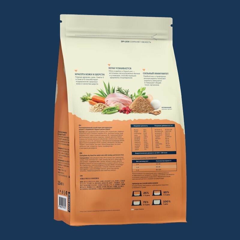 рис, гидролизованное мясо и печень индейки 10%, овсяные хлопья, жир индейки 9,5%, яйцо сушеное цельное 3%, гороховый белок, растительная клетчатка, морковь, пивные дрожжи, белки плазмы (источник иммуноглобулинов), семена льна, лососевое масло 1,4%, DL-метионин, маннаноолигосахариды (MOS), фруктоолигосахариды (FOS), клюква, минералы, витамины, таурин, гемоглобин, экстракт юкки Шидигера, экстракт зеленого чая, хлорелла, смесь токоферолов и экстракта розмарина.