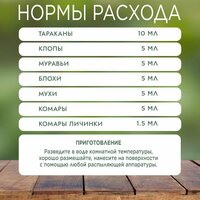 рабочую эмульсию нанести из распылителя на поверхности в местах обнаружения, перемещения или выплода насекомых (вент. короба, антресоли, плинтуса, дверные и оконные короба, места прокладки труб водо- и теплоснабжения, пол, наружные и внутренние стены строений, мусорные камеры, выгребные ямы и пр.). Приготовление рабочей эмульсии для борьбы с бытовыми насекомыми (на 1 л. воды): тараканы, осы - 10,0 мл; мухи личинки - 8,0 мл; муравьи, мухи имаго - 6,0 мл; клопы, блохи, комары имаго - 4,0 мл; комары личинки - 3,0 мл