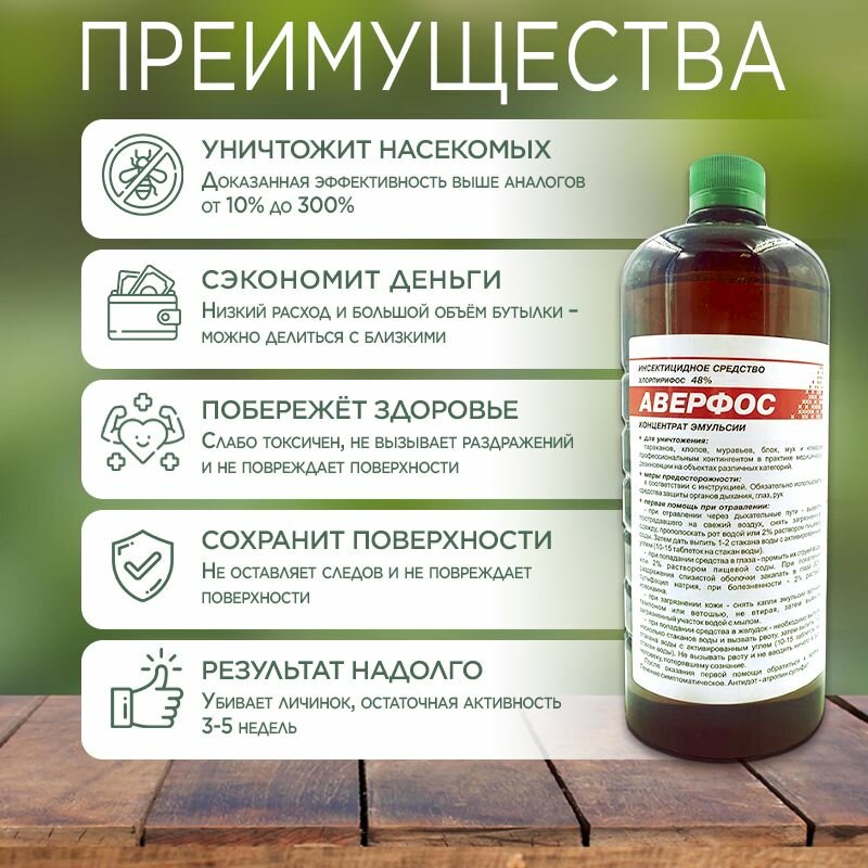 Аверфос – концентрат эмульсии, применяющийся как средство уничтожения клопов, тараканов, муравьев, мух, блох, комаров. Используется профессионалами и населением в быту.