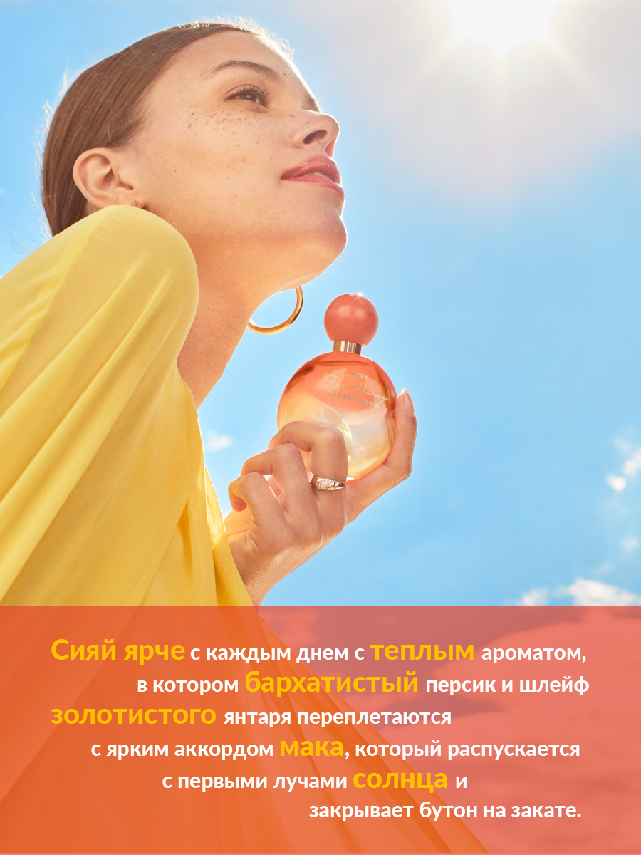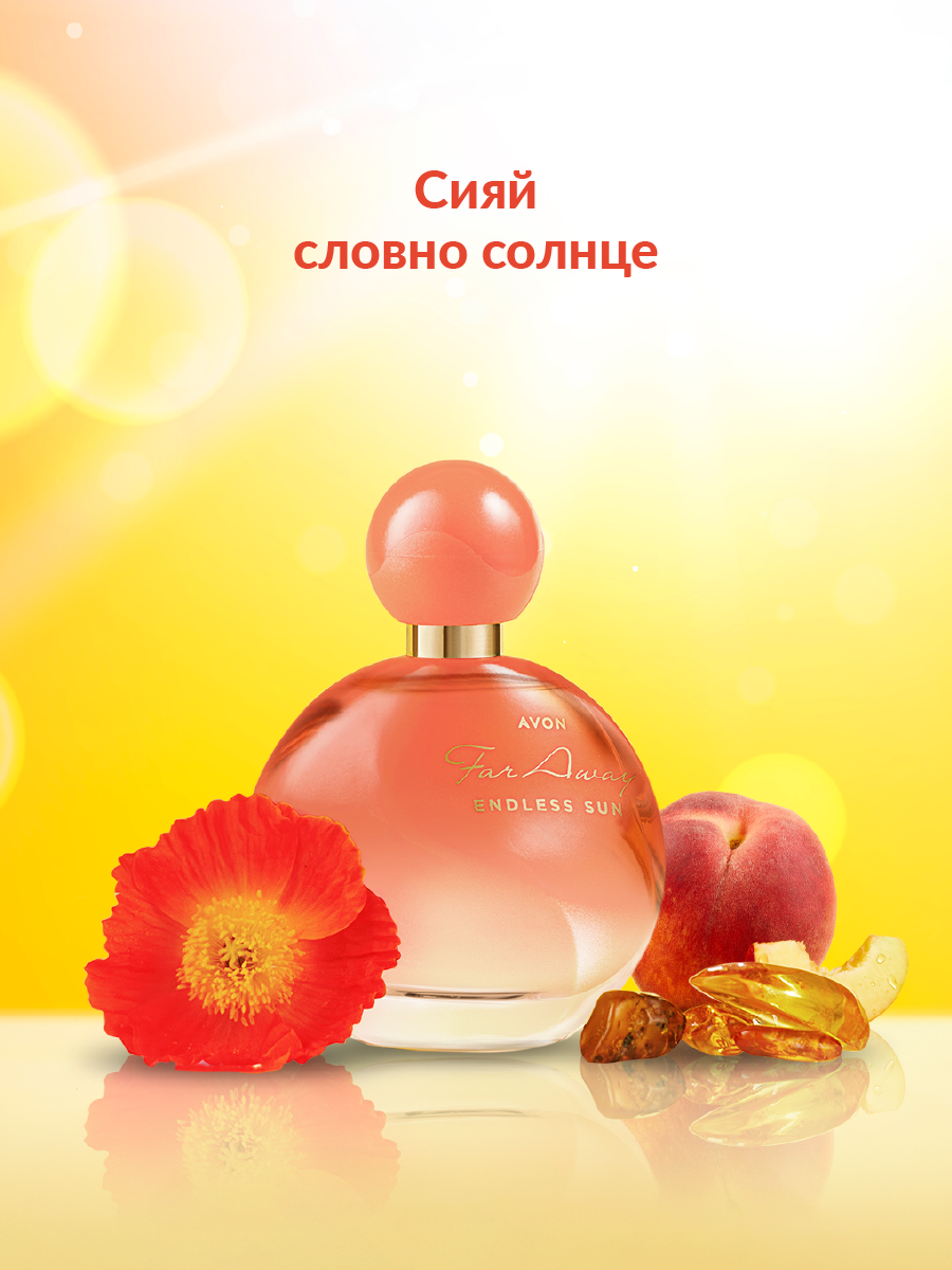 AVON. Far Away Sun. Сияй словно солнце. Сияй ярче с каждым днем с теплым ароматом, в котором бархатистый персик и шлейф золотистого янтаря переплетаютcя с ярким аккордом мака, который распускается с первыми лучами солнца и закрывает бутон на закате.