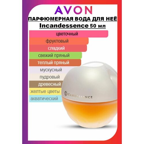 Парфюмерная вода Avon Incandessence - это восхитительный парфюмерный состав, сочетающий пирамиду восточных цветочно - фруктовых ароматов. Эйвон Incandessence был разработан в парфюмерном доме Givaudan, парфюмером Стив Де Меркадо. Верхние ноты: ландыш, бергамот, белый персик. Ноты сердца: мимоза, роза, длинно-цветковая лилия. Шлейфовые ноты: сливочный мускус, гвоздика, древесина тикового дерева. Парфюмерная вода создана специально для женщин с утонченным вкусом и уникальным восприятием красоты. Твое внутреннее сияние. Изысканная, лучистая композиция из душистого ландыша, терпкого аромата мимозы и сливочного мускуса согревает теплом благодаря маслу жасмина. Этот натуральный компонент получают из цветков, которые собирают только в предрассветные часы. Именно этот нюанс делает масло настолько уникальным - в аромате Incandessence оно закрепляет "солнечный" аспект, поддерживая звучание мимозы, мускуса и ландыша, помогая раскрывать энергию этих нот. Темное, янтарное и плотное, оно прекрасно усиливает цветочные композиции. ТИП аромата: цветочный ноты: