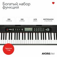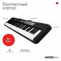 Синтезатор Avoris B61 - это идеальный выбор для тех, кто мечтает научиться играть на музыкальном инструменте. Этот синтезатор имеет 61 клавишу, микрофон и педаль, что позволяет вам полностью погрузиться в процесс творчества. В отличии от конкурентов данной ценовой категории, в Avoris B61 клавиши чувствительны к касанию, это означает, что сила нажатия влияет на интенсивность звука, как на пианино - что обеспечивает реалистичное звучание и больше самовыражения.