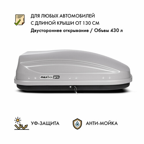 Стильный и надёжный автобокс популярного производителя MaxBox PRO 430 литров серого цвета (фактура поверхности "песок") с двусторонним открыванием. Подходит для любых автомобилей, имеющих длину крыши от 130 см. Установка возможна на любые прямые поперечины шириной до 8,5 см (скобы с барашками – в комплекте) Трехточечная система запирания с защитой (центральный замок). Крепление на скобы с возможностью плавной регулировки под имеющееся расстояние между поперечин. Габаритные размеры: 136*96*42 см. В комплекте: стяжные ремни для крепления груза. Дополнительно можно приобрести алюминиевые усилители дна автобокса. Вес автобокса – всего 11,5 кг, грузоподъемность до 50 кг. Материал – АБС-пластик. При изготовлении листа АБС-пластика используется присадка «анти-мойка» для устойчивости к воздействию моющих средств, а также присадка УФ-стабилизации для дополнительной защиты от выцветания и воздействия солнечных лучей.