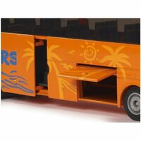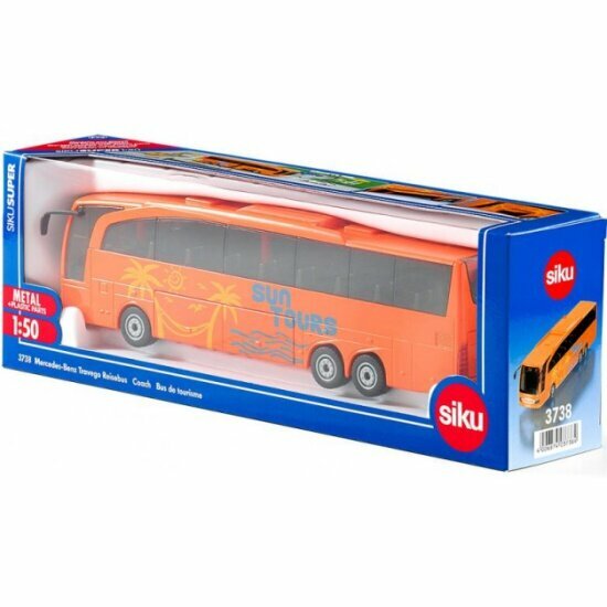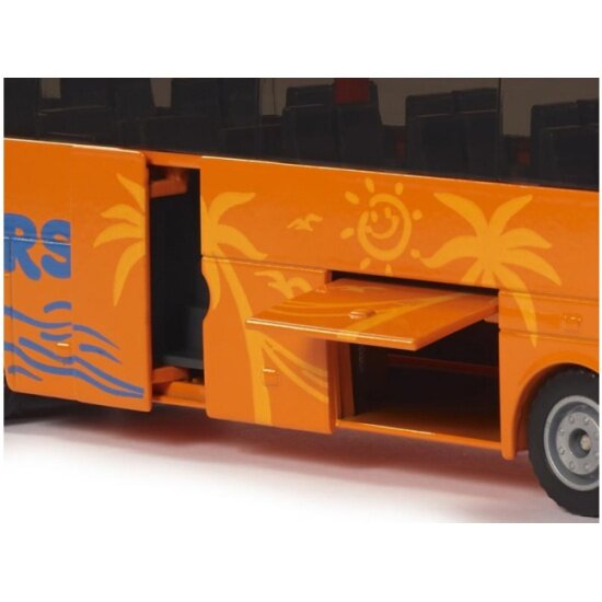 Модель машины Siku тщательно проработана, ее основные материалы - прочный металл и пластик, окрашенные в ярко-оранжевые тона. Колёса оснащены резиновыми покрышками и вращаются, коллекционный автобус можно катать. Оба багажных отсека можно открывать.