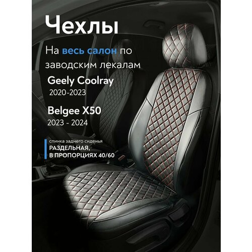 Авточехлы на сиденья Джили Кулрей (Geely Coolray) 2020-2023, Белджи Х50 (Belgee X50) с 2023 г, (спинка заднего сидения раздельная), из экокожи, ромб, черные с красной строчкой: сравнение цен, характеристики, фото, актуальное наличие и цены.