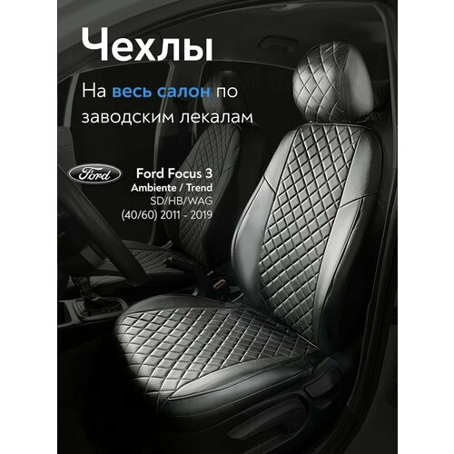 Купить Авточехлы на сиденья Форд Фокус 3 (Ford Focus 3 Ambiente)/ Тренд (Trend) SD/HB/WAG с 11-19 г. в. (спинка заднего сидения раздельная 40/60, без подлокотника), из экокожи, Ромб, черные с доставкой по всей России.
