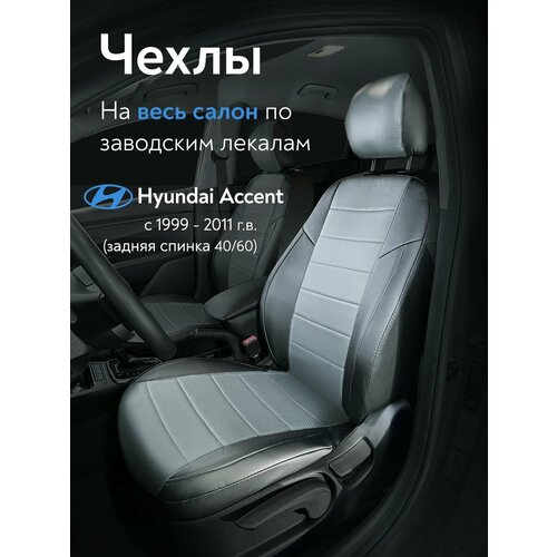 Авточехлы на сиденья Хендай Акцент 1999-2011 г. в. (Hyundai Accent) (спинка заднего сидения 40/60, без подлокотника) из экокожи, черные с серым: сравнение цен, характеристики, фото, актуальное наличие и цены.