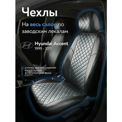 Авточехлы на сиденья Хендай Акцент 1999-2011 г. в. (Hyundai Accent) (спинка заднего сидения 40/60, без подлокотника) из экокожи, ромб, черные с серым: сравнение цен, характеристики, фото, актуальное наличие и цены.