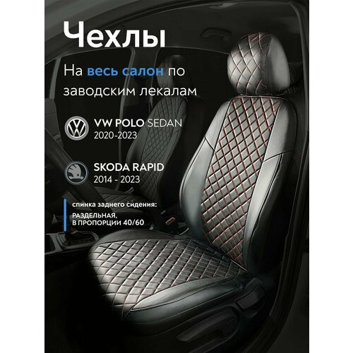 Авточехлы Шкода Рапид 2014-2023 г. в. (Skoda Rapid)/ Фольксваген Поло 2020-2023 г. в.(Volkswagen Polo sd)(без подлокотника, спинка заднего сидения 40/60), из экокожи, ромб, черные с красной строчкой: сравнение цен, характеристики, фото, актуальное наличие и цены.