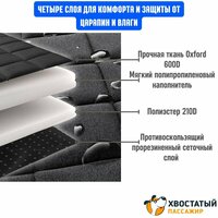 Автогамак имеет несколько слоев - внешняя его сторона выполнена из высокопрочной и долговечной ткани Оксфорд 600, которая не допускает попадания пыли, влаги и грязи с лап питомца на обивку заднего ряда. Мягкая подкладка и плотный синтетический слой препятствуют разрыву ткани когтями и задерживают остаточную влагу. На нижнюю часть автогамака (также слой ткани Oxford 600D) нанесено резиновое покрытие, благодаря которому гамак не скользит по сиденью.