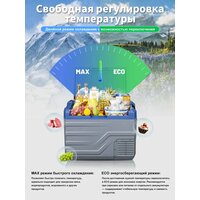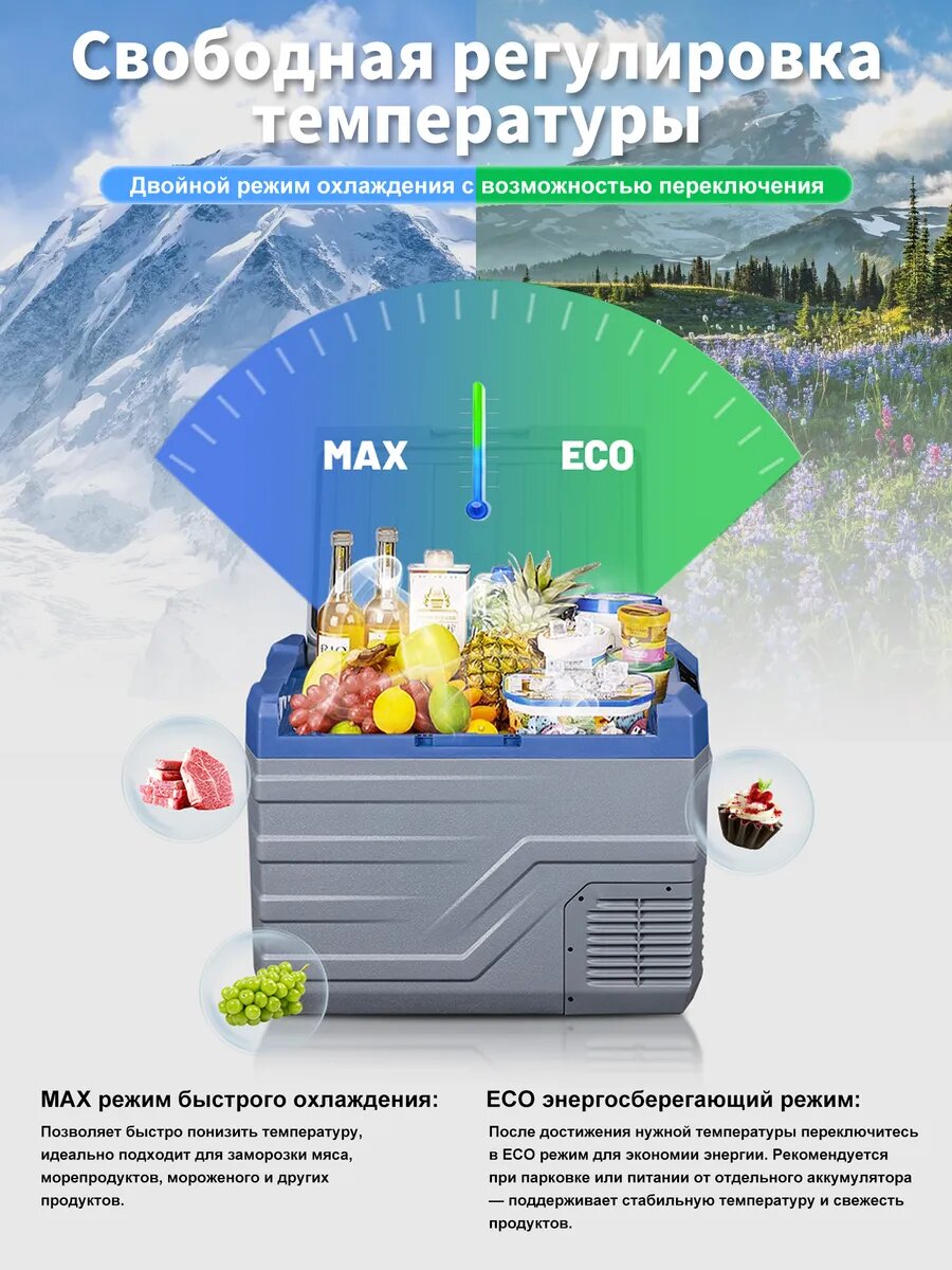 Высокопроизводительный компрессор, работающий от бортовой сети 12/24 В, поддерживает температурный диапазон от +20 до -20 °C. Чтобы быстро заморозить содержимое можно включить режим MAX, при котором аппарат функционирует на максимальной мощности, а функция ECO направлена на экономичный расход энергии.
