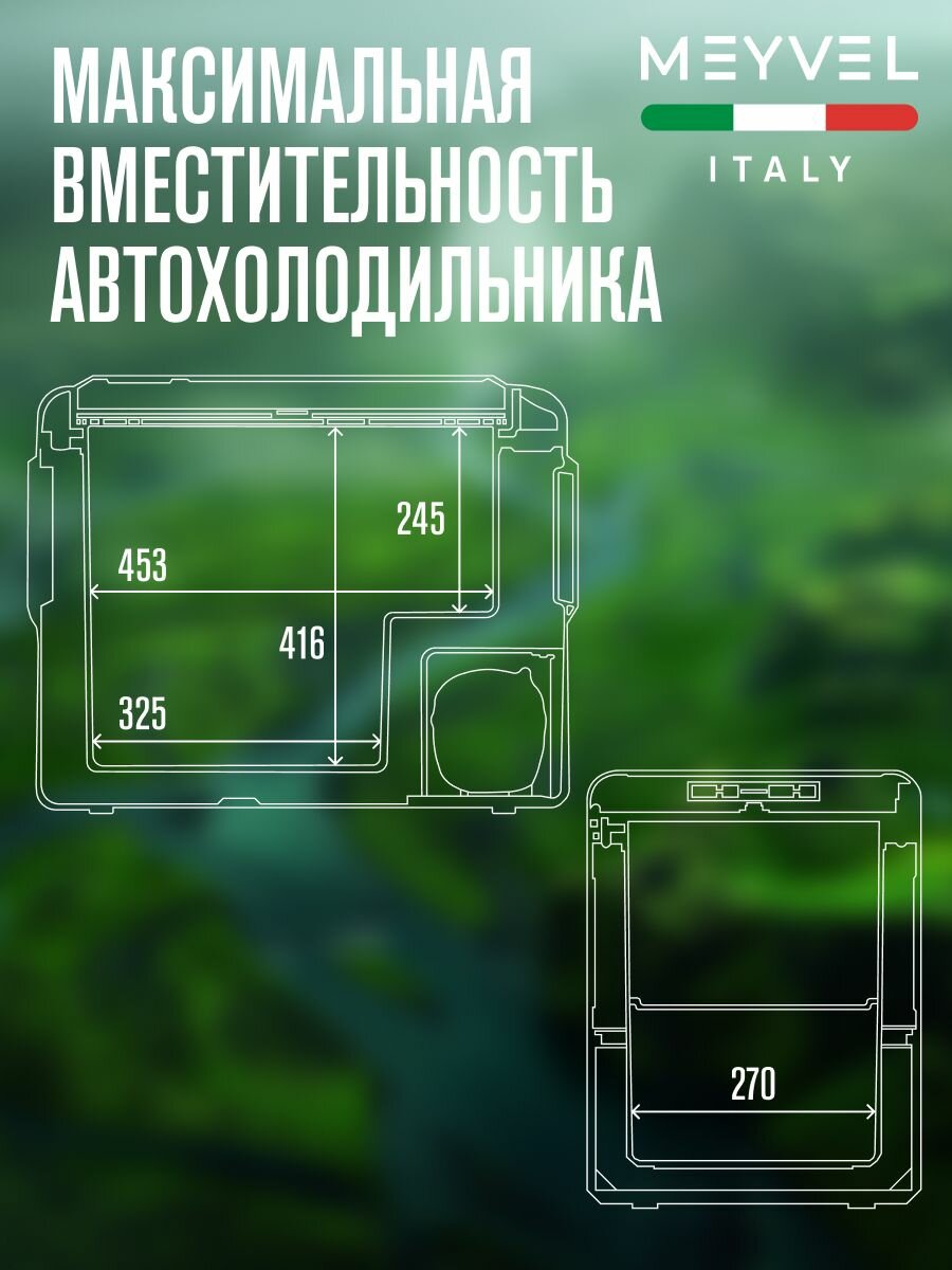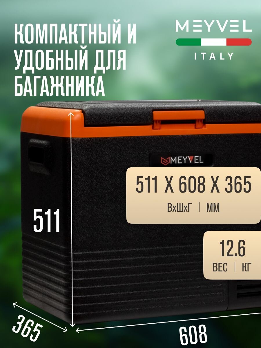 Любите автомобильные путешествия и отдых на природе в компании друзей? А может Вы – дальнобойщик, который длительное время проводит в дороге? Тогда Вы точно сталкивались с проблемой перевозки и хранения продуктов. Отличным решением в таком случае станет современный портативный компрессорный автохолодильник. Meyvel AF-K50 – надежный помощник в вопросе качественного и долгосрочного хранения продуктов и напитков. Устройство с прочным корпусом с легкостью разместится в багажнике Вашего автомобиля, а удобные крепкие ручки облегчат его переноску. Холодильник работает от сети 12/24V (адаптер на 220V приобретается отдельно), рассчитан на 50 литров. Преимущества Защита от разрядки аккумулятора; Защита компрессора от перегрева; Автоматический контроль температуры; Работает от солнечных батарей; Подстаканники. Кроме того, данная модель имеет три режима работы: Стандартный. Вы самостоятельно можете установить внутри холодильника нужную температуру; Турбо. Позволяет срочно заморозить содержимое; Экономичный. При этом режиме устройство расходует меньше энергии, сохраняя свежесть продуктов. Вместительное внутреннее пространство позволяет организовать качественное хранение продуктов и напитков в долгих автомобильных поездках. А благодаря широкому температурному диапазону Вы с легкостью сможете разместить в нем большое количество продуктов абсолютно на любой вкус. Соблюдение стандартов качества и соответствие современным тенденциям. Вам больше не придется прерывать свое путешествие для того, чтобы перекусить в сомнительных закусочных и магазинах. Больше не нужно переплачивать за некачественные перекусы и портить свое здоровье. С Meyvel AF-K50 любимая еда и напитки, в свежести которых можно не сомневаться, всегда под рукой. Основные характеристики автохолодильника Тип охлаждения: Компрессорный Внутренний объем, л: 50 Напряжение, В: 12/24 Количество камер, шт 1 Температура, °C: +20/-20 Тип установки: Переносной Защита испарителя: Да Угол наклона компрессора: До 45° Технические параметры автохолодильника Сила тока, А при 12/24/220 В: 6 / 3 / 0,3 Мощность, Вт: 80 Дополнительные функции автохолодильника Подключение через прикуриватель: Да Защита от разряда аккумулятора: Да Защита компрессора от перегрева: Да Авт. контроль температуры: Да Экономичный режим: Да Турбо режим: Да Память настроек: Да Индикация ошибок: Да Работа от солнечных батарей: Да Внутреннее освещение: Нет Подстаканники: Да Ручки для переноски: Да Установочный комплект: Нет Габаритные размеры автохолодильника Высота, мм: 508 Ширина, мм: 587 Глубина, мм: 365 Внутренние размеры (ВxШxГ), мм: 410 х 320 х 270 Размеры упаковки (ВxШxГ), мм: 565 x 654 x 418 Вес нетто, кг: 13 Вес брутто, кг: 13,5 Тип управления: Электронное Термостат: Электронный Электромагнитная совместимость: Да Материал корпуса: Пластик Изоляция: Полиуретановая пена высокой плотности Хладагент: R134A