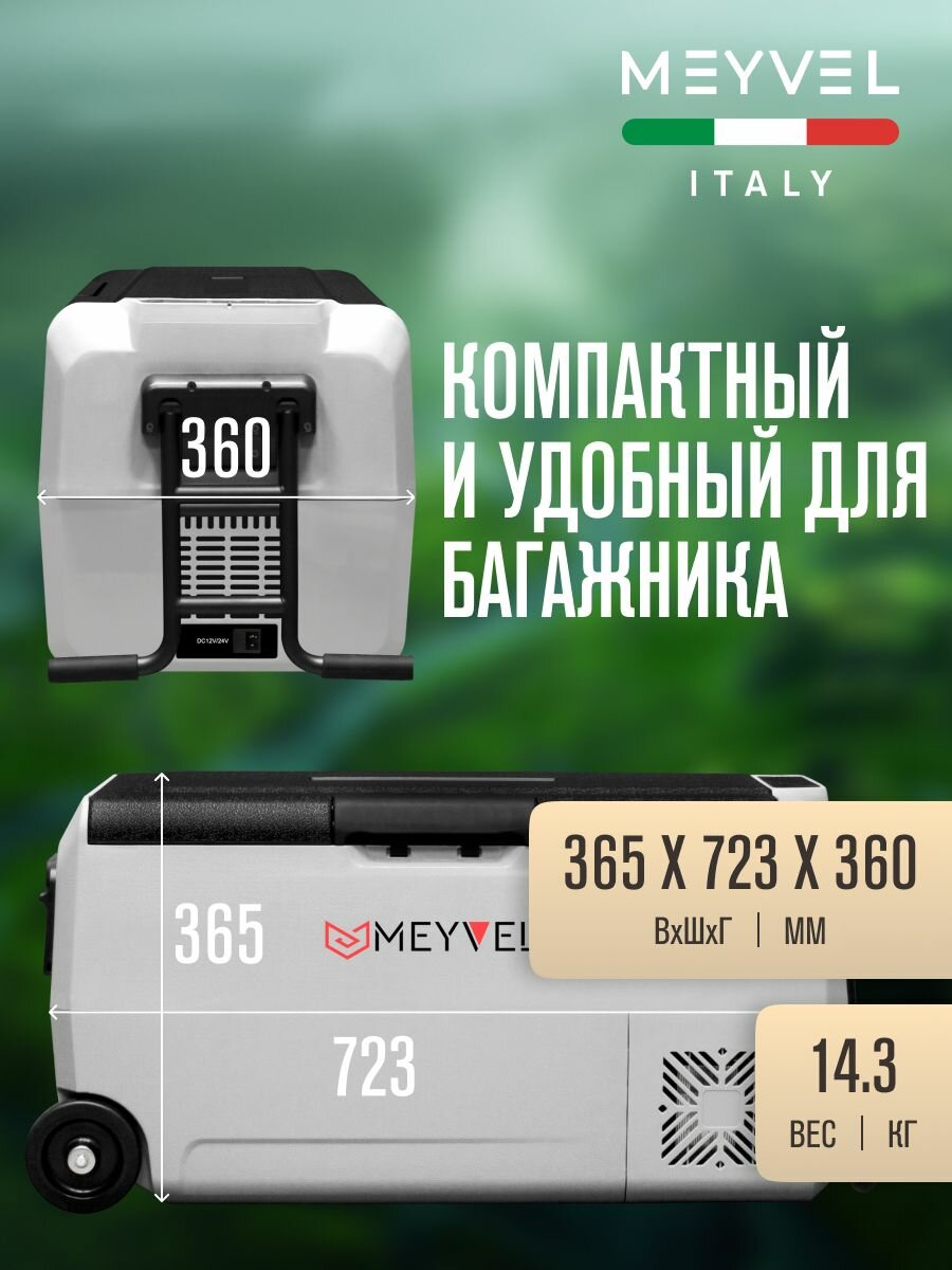 Холодильник автомобильный MEYVEL AF-SD36, 36л. температурный диапазонтемпература от +20°С до -20°С. Холодильник MEYVEL AF-SD36 имеет две камеры, каждую из которых можно использовать как для охлаждения, так и для заморозки продуктов (до -20°С). управлениес помощью сенсорной панели управления Вы сможете быстро и легко управлять всеми функциями холодильника. Также имеется USB порт для зарядки Ваших гаджетов. питание 12V/24VРаботает от прикуривателя или от сети переменного тока (адаптер приобретается отдельно). комфорт В использованиимодель AF-SD36 оснащена удобной ручкой, благодаря которой Вам будет удобно перемещать автохолодильник без использования транспорта, что безусловно добавит комфорта любому путешествию. мобильностьданная модель автохолодильника оснащена колесами. Это очень практичный и удобный вариант для хранения и перемещения продуктов в путешествиях. мобильное приложениеуправляйте всеми функциями холодильника дистанционно через мобильное приложение MEYVEL CAR FRIDGE на Android / iOS. отличительные особенностидиапазон температуры от -20°С до +20°С; Две камеры охлаждения; Управление через / iOS; Угол наклона компрессора до 40°; USB порт; Трёхуровневая система защиты от разряда аккумулятора; Защита компрессора от перегрева; Автоматический контроль температуры; Работает от солнечных батарей; Прочный пластиковый корпус. Компрессорный автохолодильник Meyvel AF-SD36Итальянская компания MEYVEL была основана в Сицилии. Инновационная модель автомобильного холодильника AF-SD36 отлично подойдет для транспортировки и хранения любимых продуктов и напитков. В данной линейке есть похожие модели другого объёма : AF-SD50 и AF-SD60 Компрессорный автохолодильник Meyvel AF-SD36 – это компактный переносной холодильник, который можно не только переносить, но и перевозить - для этого у холодильника есть колёса и удобная транспортировочная ручка. Благодаря съёмной перегородке, внутреннюю область холодильника можно разделить на две камеры, что позволяет и охлаждать, и замораживать продукты одновременно (температура в каждой камере настраивается отдельно и поддерживается автоматически). Так же, перегородку можно снять и тогда получится одна большая камера с максимальной вместимостью. Управление всеми функциями через смартфонДизайнеры и инженеры Meyvel позаботились о Вашем комфорте и разработали мобильное приложение «MEYVEL CAR FRIDGE», благодаря которому Вы можете управлять холодильником всего лишь одним касанием. Включайте и отключайте автомобильный холодильник, меняйте и настраивайте температурный режим прямо в дороге. Теперь, когда управление авто холодильником стало простым и понятным, Вам и Вашим близким остается лишь наслаждаться путешествием. Температурный режимДиапазон температуры у этой модели от +20°С до -20°С. Автохолодильник для путешествийЭта модель подходит для установки не только в легковые автомобили, но и в грузовые, а так же микроавтобусы, катера, автодома и кемперы. Питание осуществляется от прикуривателя (12 или 24 В). Автохолодильник оснащён тихим высокопроизводительным компрессором с системой защиты от разгерметизации. Благодаря оптимизированному программному обеспечению и регулируемой скорости вращения, Вы можете эффективно поддерживать нужную температуру продуктов и напитков в дороге и на природе. Испаритель располагается на всех четырёх сторонах корпуса и бл
