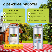 – Паровой режим (1–3 л воды): Нагрев до 120°C занимает всего 20 минут, что позволяет консервировать в 3 раза быстрее. Остывание занимает около 1 часа. Подходит для винтовых и жестяных крышек.