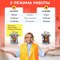 Девайс для кухни готовит в паровом и жидкостном режимах и не требует предварительной накачки давления. Автоклав сэкономит ваше время и средства при приготовлении блюд по любимым рецептам. Для стерилизации в паровом режиме достаточно всего 2,5 литров воды, а время готовки сокращается в 3,5 раза. Для выхода на рабочую температуру потребуется в пять раз меньше электроэнергии.