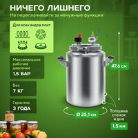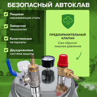 C автоклавом Wein classic вы без труда приготовите вкусные консервы - тушенку из мяса, рыбы, птицы, а также соления, компоты и даже варенья! Автоклав Вейн классик прост в использовании - справится даже новичок Готовьте до 10 банок консервов от 20 минут 2 режима на выбор – экономичный «паровой» и классический «на воде». Выбирайте тот, что больше нравится. Не требует преднакачки давления, как в других аппаратах Автоклав домашний Вейн абсолютно безопасен: Защита 100% от срыва крышек. В крышке аппарата есть обратный клапан, который во время остывания выравнивает давление внутри банок и автоклава, тем самым исключая риск срыва крышек из-за разницы давления. Контроль качества - каждый аппарат проходит 5 этапов контроля качества. Прочные швы - на производстве используем только автоматическую сварку. Благодаря этому место стыка не перегревается и металл сохраняет свои свойства, защищающие от коррозии. Никакой ручной сварки - брак полностью исключен Корпус автоклава выполнен из прочной медицинской стали AISI 430, которая долговечна и устойчива к коррозии. Клапан сброса давления: в случае возникновения излишнего давления во время работы, стравит излишки, обеспечит полную безопасность. Прочные термостойкие ручки с полиамидным покрытием - не нагреваются, защищают руки от ожога, Благодаря им автоклав удобно ставить и снимать с плиты. Автоклав домашний для тушенки WEIN удобный и универсальный: Используйте любые крышки и банки разного объема - так как нет общих кассет для фиксации крышек. Крышки Твист-офф или СКО на ваш выбор. Обратите внимание, что для СКО потребуются специальные зажимы. Автоклав для тушенки подходит для всех типов плит. Закрывайте крышку одним движением благодаря технология One Lock На закладку банок уйдет не больше 1 минуты. Быстро и удобно. Крышка фиксируется 7-дюймовым хомутом, изготовленным из пищевой стали. герметичность стыка достигается благодаря силиконовому уплотнению, которое ставится в углубление и не смещается даже при большом давлении.