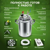 Емкость автоклав, крышка, фальшдно, уплотнение, хомут клампа, ключ для клампа, кран, штуцер, манометр, термометр, предохранительный клапан, зажим для термометра, обратный клапан, хомут для шанга, шланг, инструкция