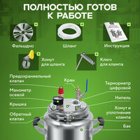 | Подробная комплектация | Емкость автоклав, крышка, фальшдно, уплотнение, хомут клампа, ключ для клампа, кран, штуцер, манометр, термометр, предохранительный клапан, зажим для термометра, обратный клапан, хомут для шанга, шланг, инструкция |