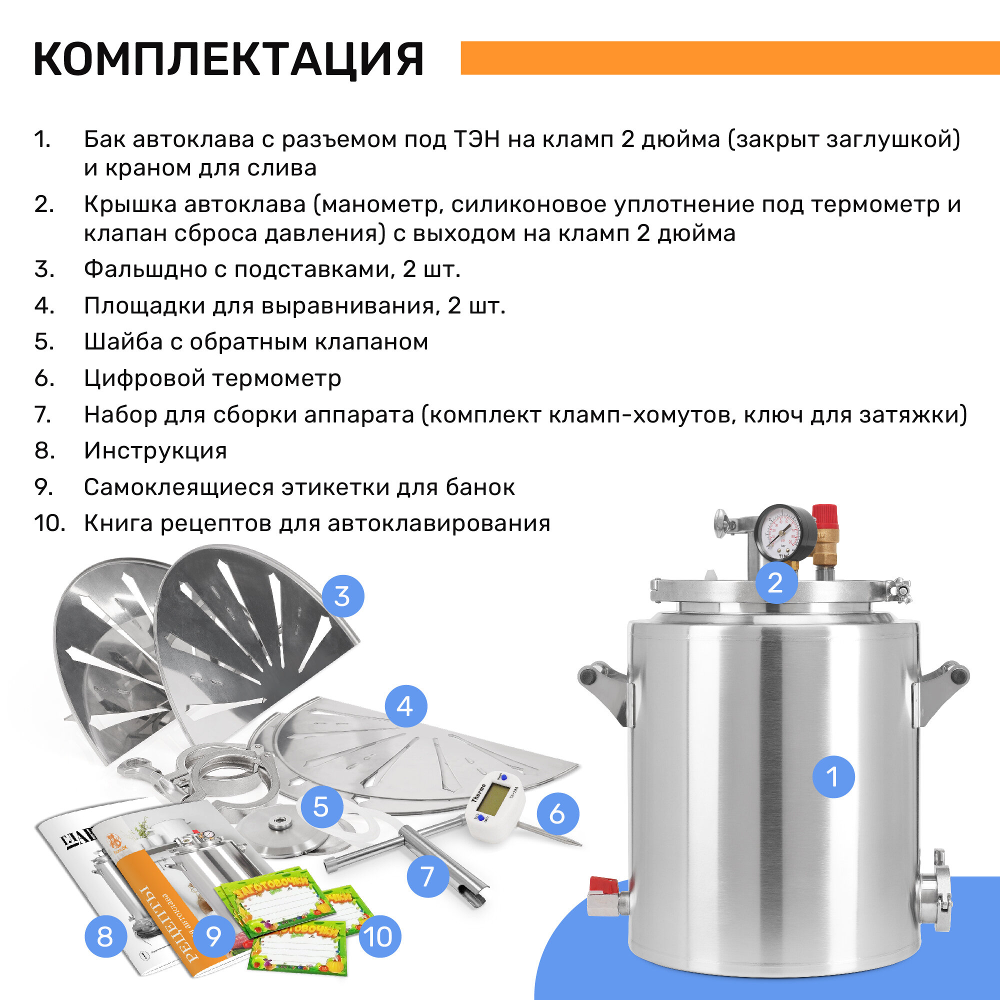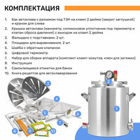 | Подробная комплектация | 1. Бак автоклава; 2. Крышка автоклава; 3. Манометр; 4. Электронный термометр, 1 шт; 5. Клапан сброса давления, 1 шт 6. Шланг силиконовый 1; 7. Фальшдно с подставками, 2 половины; 8. Площадки для выравнивания,2 половины; 9. Врезка под ТЭН с заглушкой на кламп-хомуте; 10. Выход на 2 дюйма с заглушкой с обратным клапаном и кламп-хомутом; 11. Кран для слива, 1 шт; 12. Штуцер, 1 шт; 13. Парогаситель; 14. Кламп-хомут 2 дюйма, 2 шт; 15. Уплотнение на кламп-хомут 2 дюйма, 2 шт; 16. Заглушка с обратным клапаном; 17. Кламп-хомут 8 дюймов; 18. Уплотнение на кламп-хомут 8 дюймов; 19. Инструкция; Приобретайте полностью готовый к работе автоклав ГлавАвтоклав объемом 24 литра! |