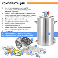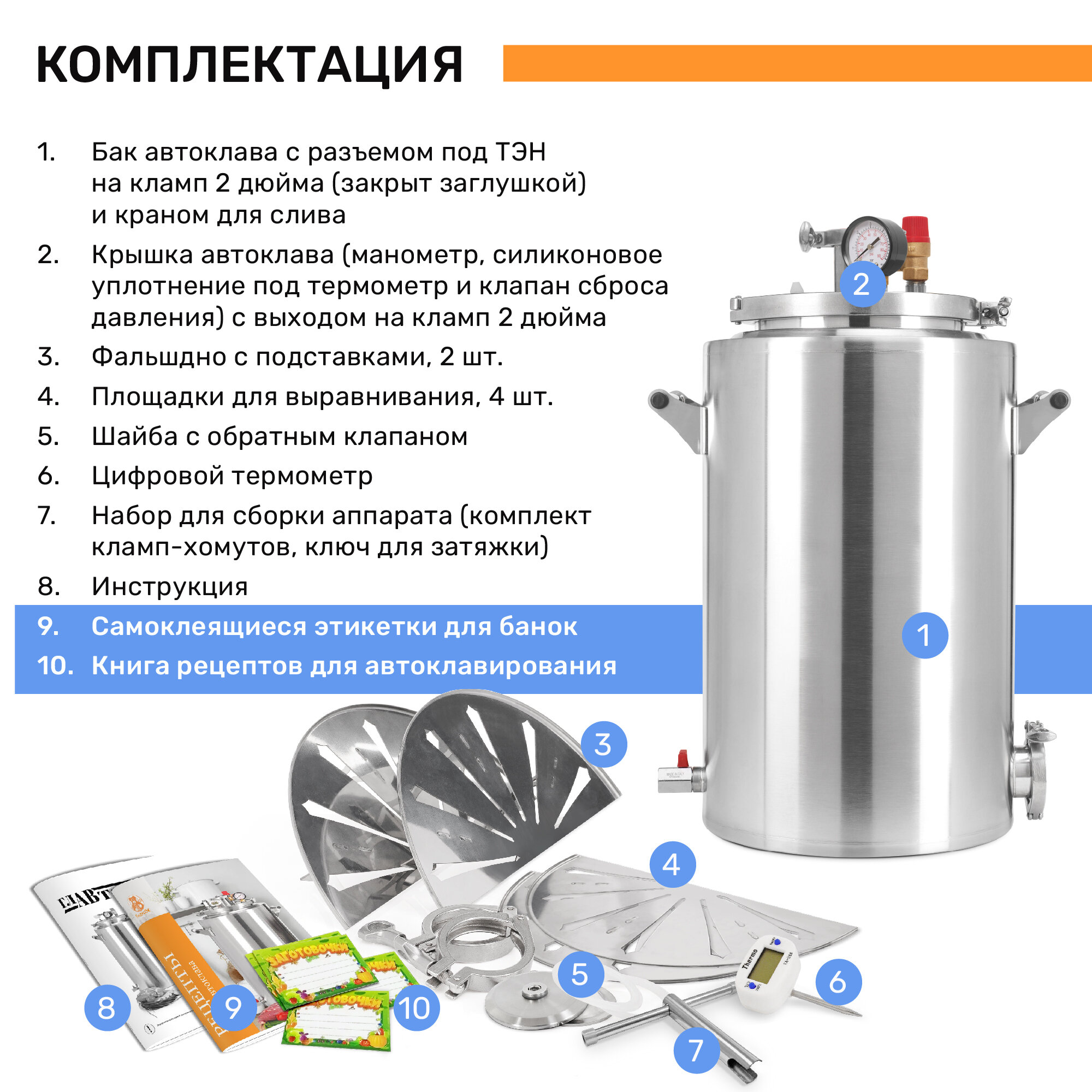 | Подробная комплектация | 1. Бак автоклава; 2. Крышка автоклава; 3. Манометр; 4. Электронный термометр, 1 шт; 5. Клапан сброса давления, 1 шт 6. Шланг силиконовый 1; 7. Фальшдно с подставками, 2 половины; 8. Площадки для выравнивания,2 половины; 9. Врезка под ТЭН с заглушкой на кламп-хомуте; 10. Выход на 2 дюйма с заглушкой с обратным клапаном и кламп-хомутом; 11. Кран для слива, 1 шт; 12. Штуцер, 1 шт; 13. Парогаситель; 14. Кламп-хомут 2 дюйма, 2 шт; 15. Уплотнение на кламп-хомут 2 дюйма, 2 шт; 16. Заглушка с обратным клапаном; 17. Кламп-хомут 8 дюймов; 18. Уплотнение на кламп-хомут 8 дюймов; 19. Инструкция; Приобретайте полностью готовый к работе автоклав ГлавАвтоклав объемом 24 литра! |