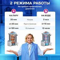 Паровой автоклав Вейн вмещает до 40 банок консервов по 0.5л за одну загрузку или до 30 банок с подключенным блоком управления. 2 режима работы скороварки: на пару и на воде. Время приготовления блюд сократится в разы, освободив вас от длительного стояния у плиты. В консерватор дачный можно загружать классические закаточные банки и банки с закручивающимися твист-офф крышками. Для стерилизации продуктов в паровом режиме потребуется залить в бак кухонной утвари всего 2,5 л воды.