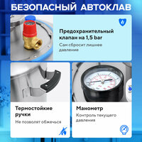 Автоматический выход на рабочий режим при готовке «на пару». Вам не нужно вручную перекрывать кран после стравливания воздуха. Новый клапан сам закрывается в нужный момент под действием внутреннего давления автоклава, избавляя вас от необходимости стоять у аппарата и выжидать нужный момент. Следить за временем приготовления блюд можно по показаниям термометра и манометра.