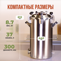 Автоматический автоклав «Паромаг люкс» c тройной системой клапанов –Ваш надёжный помощник для приготовления продуктов! Профессиональный аппарат с объемом 37 литров обеспечивает стерилизацию продуктов благодаря созданию избыточного давления и высокой температуры. Корпус изготовлен из нержавеющей стали марки AISI 304, что гарантирует долговечность и устойчивость к коррозии. Тройная система клапанов обеспечивает высокий уровень безопасности во время работы. С помощью автоматической системы клапанов температура и давление внутри ёмкости поддерживается без вашего участия, поэтому не нужно постоянно контролировать процесс приготовления. Крышка автоклава оснащена 2 клапанами для разных температурных режимов 115 и 120 градусов. Выбери свой режим готовки! На дне автоклава предусмотрены специальные ребра жёсткости, благодаря этому дно не деформируется под действием давления и высокой температуры, сохраняет устойчивую форму во время эксплуатации. Имеется выход под ТЭН на 2 дюйма и муфтой с резьбой 1/2 для установки крана. Совместим с любыми типами плит, кроме индукции, т. к. металл не магнитный. Емкость из стали AISI 304 можно использовать для приготовления кисломолочных продуктов, маринада, варки пива, сыра и холодца. Автоклав «Паромаг люкс» самый вместительный в своем литраже, позволяет готовить за 1 раз до 32 банок на пару всего за час. К тому же, кламп 2 дюйма на крышке дает возможность модернизации под самогонный аппарат, присоединив дистиллятор или бражную колонну. Выбирая автоклав «Паромаг люкс» вы получаете надежное и долговечное устройство, которое обеспечит безопасность и качество стерилизации ваших продуктов. Акции и скидки делают покупку еще более привлекательной, не упустите шанс порадовать себя или своих близких и заказать его уже сегодня! Готовьте и консервируйте с удовольствием!