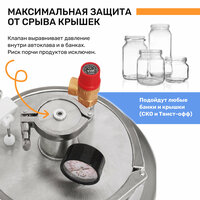 Установлен обратный клапан, аккуратно выравнивающий давление при начале и окончании процесса, ваши консервы надежно защищены от перепадов давления и температуры.