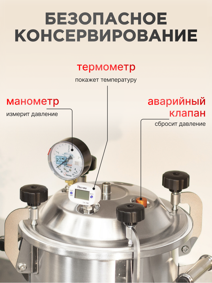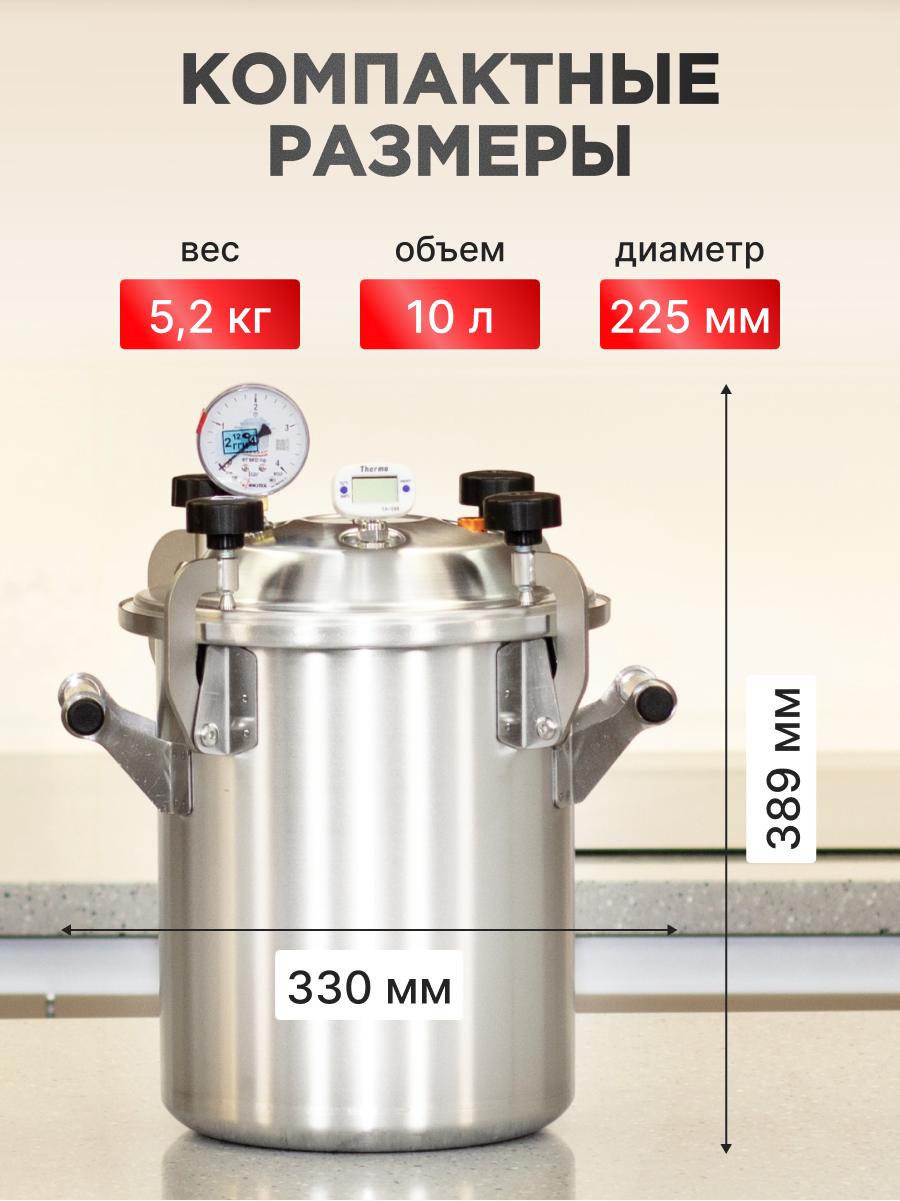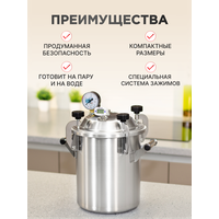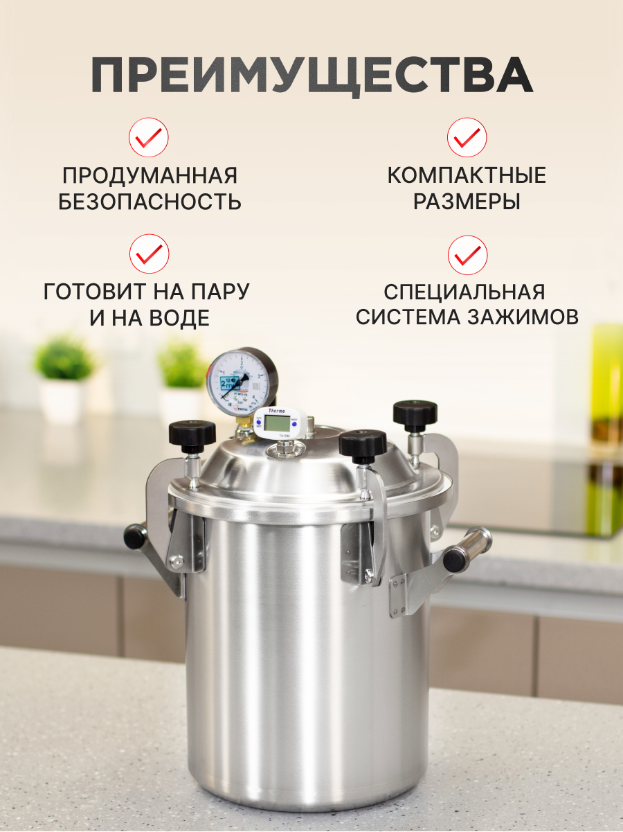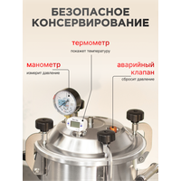 Автоклав «Заготовщик» объёмом 10 литров — это практичное и надёжное решение для домашнего консервирования. Он подходит для приготовления любых заготовок: от классической тушёнки до овощей, фруктов и других блюд. Устройство вмещает до 8 банок, обеспечивая отличный объём при компактных размерах. Крышка оснащена продуманной системой безопасности, которая гарантирует стабильную работу устройства. Модель имеет усиленное дно с рёбрами жёсткости и выполнена из прочной пищевой нержавеющей стали. Она подходит для всех типов плит, включая индукционные. Аппарат может работать как на пару, так и на воде, в зависимости от выбранного способа приготовления. Рекомендуется использовать винтовые крышки твист-офф, которые не требуют дополнительных зажимов. В комплекте идет подробная инструкция и книга рецептов, которая вдохновит на создание вкусных заготовок. Порадуйте себя и своих близких — закажите автоклав уже сегодня.