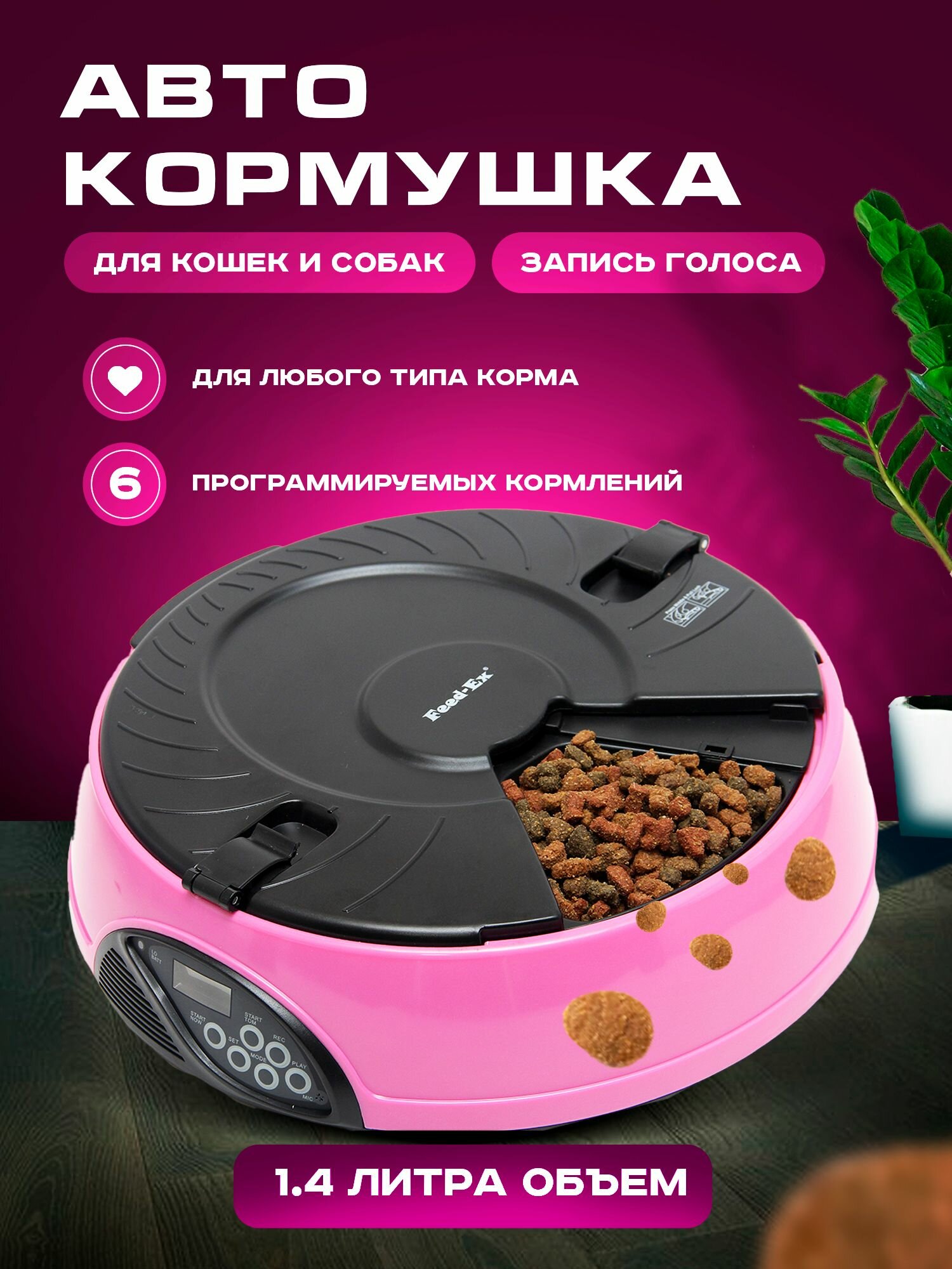 Автоматическая программируемая кормушка " Feed-Ex" с ЖК-дисплеем предназначена для любого типа корма. Кормушка разделена на 6 секторов (лотков) и в установленное время сектора поочередно открываются, и еда становится доступной для домашнего животного.