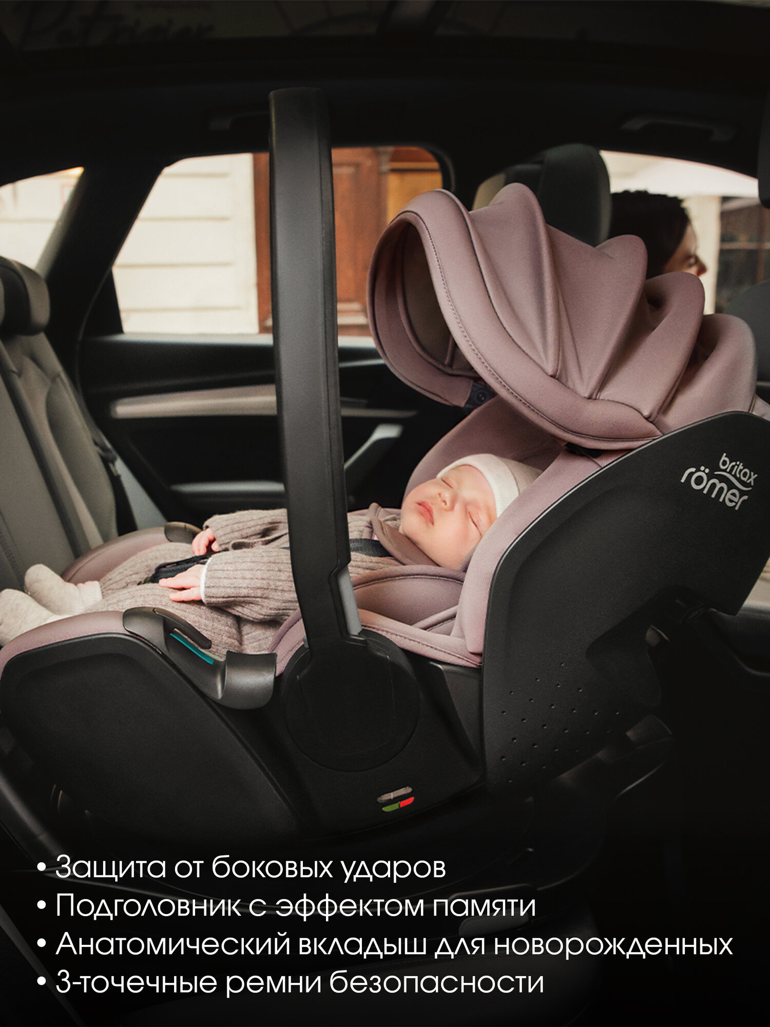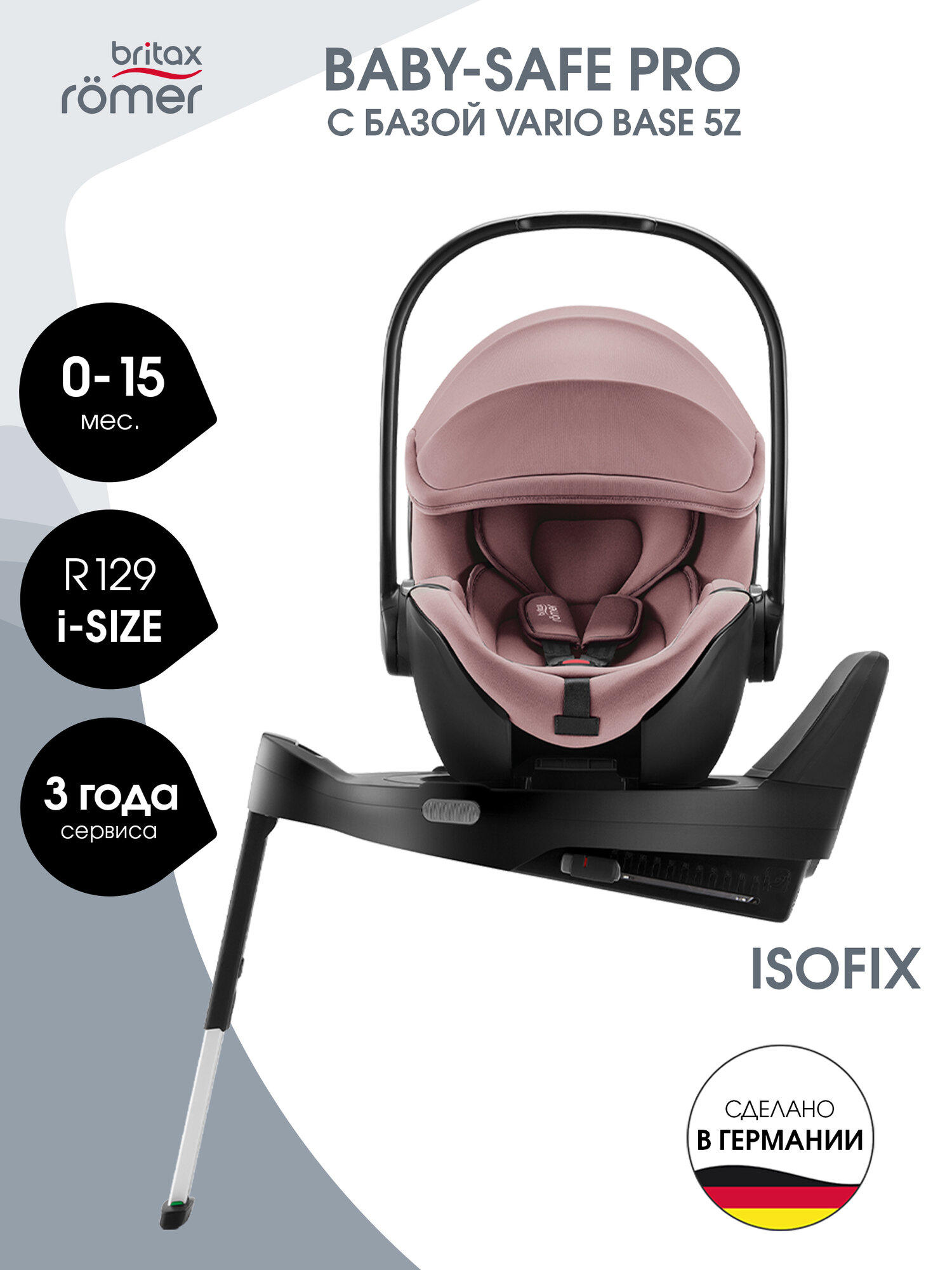 Комплект 2 в 1: автокресло BABY-SAFE PRO + поворотная база VARIO BASE 5Z с системой ISOFIX и опорной ногой. Для детей ростом 40 – 85 см (с рождения до ≈ 15 месяцев | 13 кг) BABY-SAFE PRO – инновационная, простая в использовании и самая лёгкая автолюлька для новорожденных от немецкого бренда Britax Roemer. Люлька оснащена функцией наклона спинки Ergo Recline, которая обеспечивает более ровное, естественное и при этом максимально безопасное положение малыша. Быстро и всего одним щелчком устанавливается на базу VARIO BASE 5Z*, входящую в комплект. При необходимости может крепиться только штатным ремнем (если в авто нет ISOFIX). Автолюлька совместима с большинством прогулочных колясок. Основные характеристики: Подходит для новорожденных и детей до 15 месяцев. При установке на базу функция вращения позволяет поворачивать автокресло на 90° к двери автомобиля, что упрощает посадку и пристёгивание ребёнка. Соответствует передовому европейскому стандарту безопасности R129 i-SIZE. Технология Ergo Recline. Теперь вы сами можете регулировать наклон спинки автолюльки. Полулежачее положение способствует здоровому развитию позвоночника и гарантирует, что дыхание младенца будет свободным, а не сжатым. Функцию Ergo Recline можно использовать в автомобиле на базе и со штатным ремнем безопасности, а также на коляске. Автолюлька разрешена для использования в самолете. Крепится с помощью базы с индивидуально регулируемыми креплениями ISOFIX или с помощью штатного ремня автомобиля. Устанавливается против хода движения. Благодаря звуковому щелчку вы всегда можете быть уверены, что база установлена без ошибок. Кроме того, индикатор на базе обеспечивает дополнительную уверенность в правильной установке. Защита от боковых ударов. Специально разработанная конструкция поглощает силу бокового удара, обеспечивая максимальную безопасность ребенка. В комплект входит вкладыш для новорожденных. Он выполнен из сетчатой "дышащей" ткани и имеет анатомическую форму с поглощающими удар вставками для большей защиты и комфорта малыша. Регулируемая ручка имеет несколько положений, чтобы было удобно сажать и переносить ребенка в автолюльке. Нажмите кнопки на каждой стороне ручки, чтобы разблокировать и переместить ее. Благодаря полукруглому основанию удобно укачивать малыша на ровной поверхности, в качестве ограничителя качания можно использовать регулируемую ручку люльки-переноски, опустив ее вниз до упора. Автокресло растет вместе с ребенком: мягкий подголовник с эффектом памяти (memory foam) легко регулируется одной рукой под рост малыша (около каждого положения указан рост ребенка, вы точно не ошибетесь). 3-точечные ремни безопасности удобно и безопасно фиксируют ребенка в автолюльке. Их можно отрегулировать в 3 положениях по мере роста малыша. Очень большой регулируемый солнцезащитный козырек с УФ 50+ защитит ребёнка от солнца и ветра. Комфорт в любое время года. Благодаря наличию вентиляционных отверстий в корпусе и мягких гипоаллергенных тканей чехла. Чехол и козырек съемные, можно стирать при 30 градусах. Обеспечьте своему ребенку дополнительную защиту на случай аварии: бампер базы VARIO BASE 5Z помогает предотвратить опрокидывание автокресла при столкновении. А регулируемая по высоте опорная нога фиксируется в пол автомобиля и обеспечивает устойчивость, сводя к минимуму перекос автокресла. За счёт специального ин