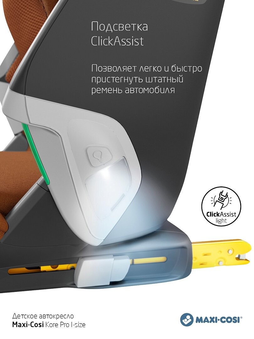 Автокресло Maxi-Cosi Kore Pro i-Size (Макси кози Коре Про Ай сайз) - автомобильное кресло, которое растет вместе с ребенком по высоте и ширине и рассчитано на рост от 100 до 150 см. Модель относиться к группе 2-3 и предназначена для детей от 3,5 лет. В таком возрасте дети хотят самостоятельности и новое кресло дает им такую возможность. Специальный дизайн модели позволит детям самостоятельно залазить и слазить с кресла и пристегиваться. Уникальная система Click Assist light подсветит замок, чтобы ребенку было удобнее и проще пристегнуться. Kore Pro i-Size также предлагает лучшую безопасность. Он соответствует самым последним и самым высоким стандартам безопасности - правилам размера i - в сочетании с системой Side Protection.