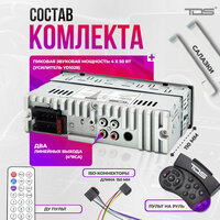 | Подробная комплектация | Автомагнитола 1 DIN, пульт ДУ, пульт на руль, ключи, инструкция, фишки |