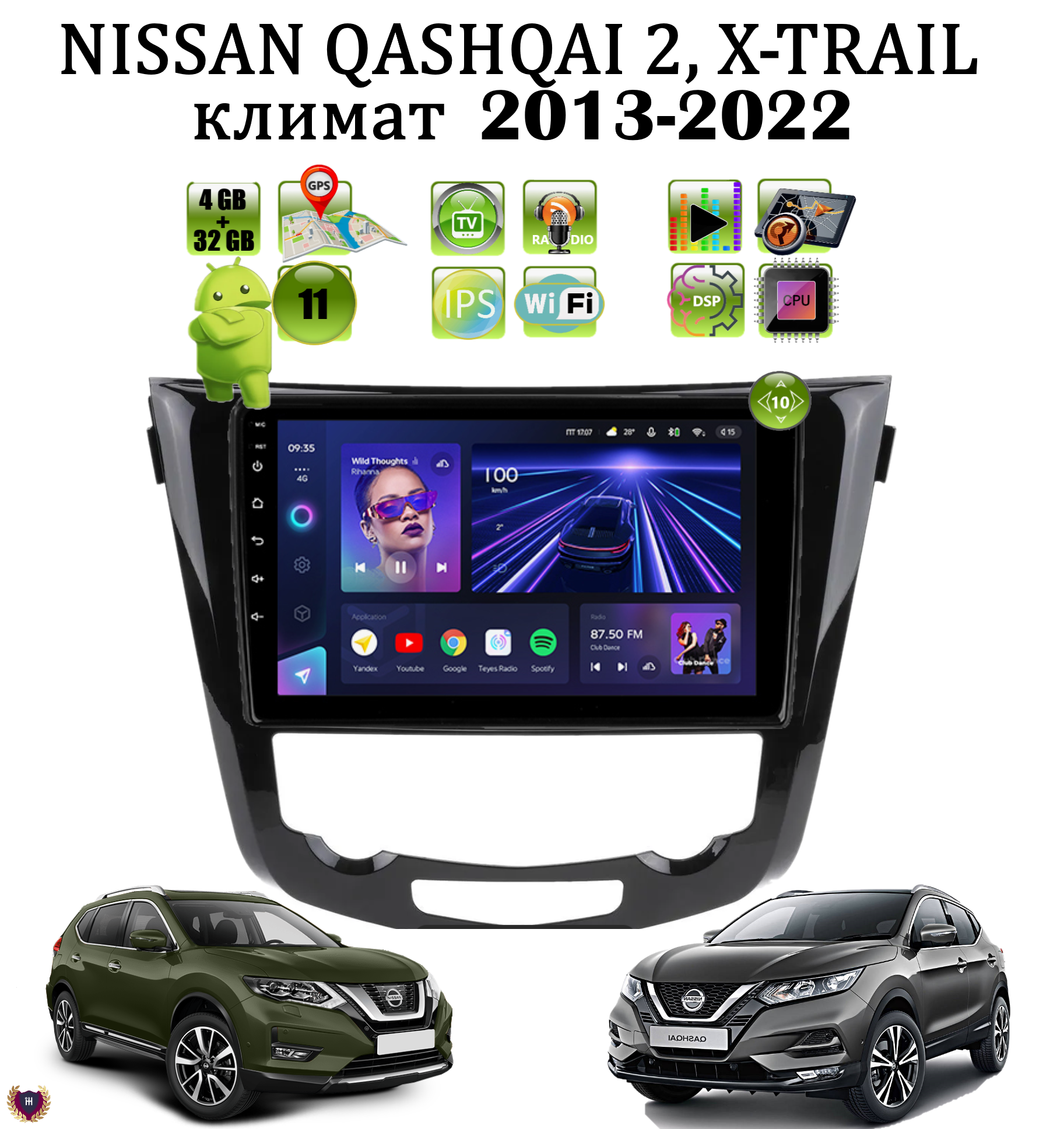 Купить Автомагнитола для Nissan Qashqai 2, X-Trail T32 (2013-2022) климат , Android 11, 4/32 GB, GPS, Bluetooth, WiFi, IPS экран, FM, сенсорные кнопки, поддержка кнопок на руле с доставкой по всей России.