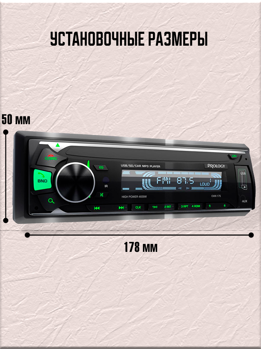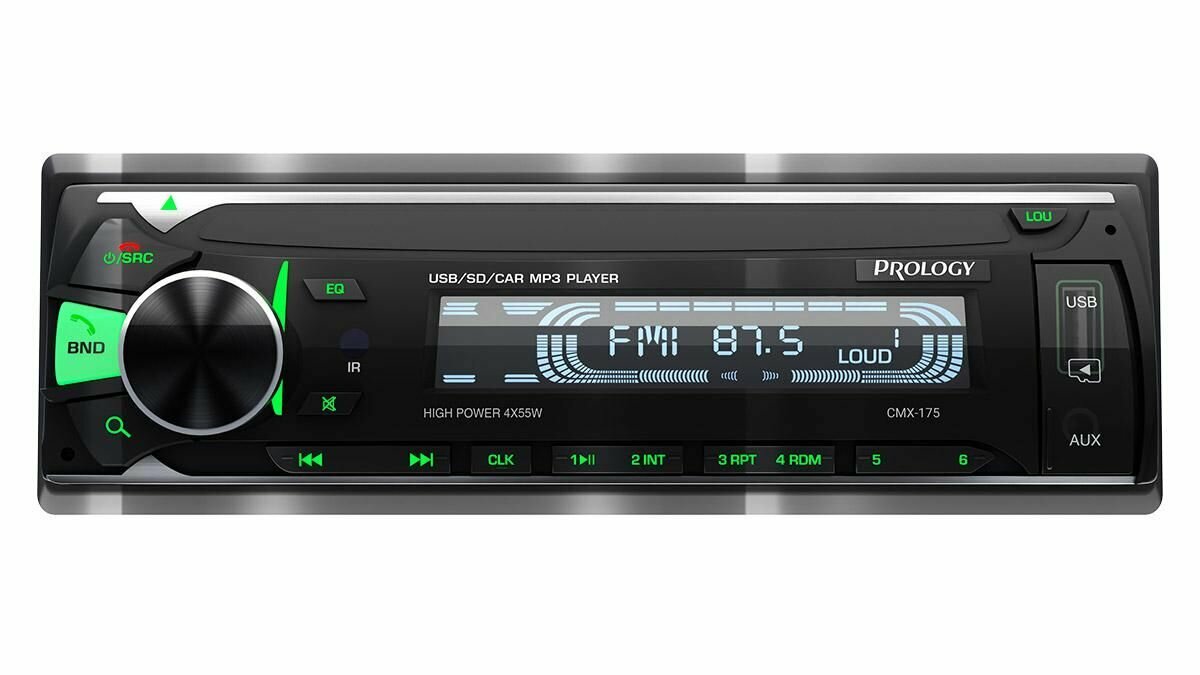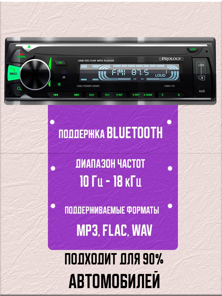 PROLOGY CMX-175 — FM SD/USB ресивер с Bluetooth, это автомагнитола стандартного размера 1DIN, которая обеспечивает прием радиостанций в диапазоне FM, воспроизведение медиафайлов, записанных на карты памяти USB / microSD, передачу звука с внешних источников, а также управление мобильным телефоном через интерфейс Bluetooth (ver. 4,2). Кроме того, устройством можно управлять с помощью приложения, установленного на Ваш смартфон с операционной системой Android.*