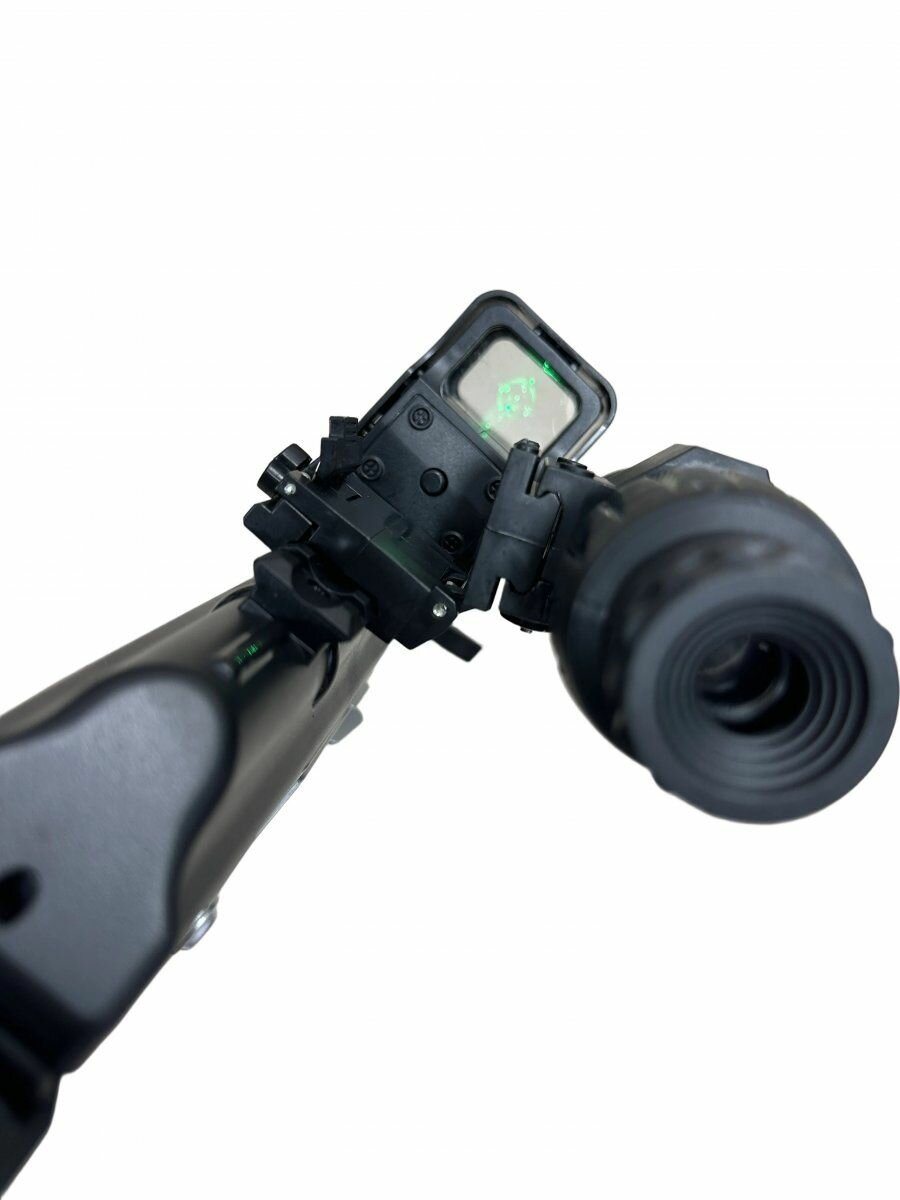 - Лазерный целеуказатель (ЛЦУ) и тактический фонарь на планках Пикатинни для быстрого целеуполномания.