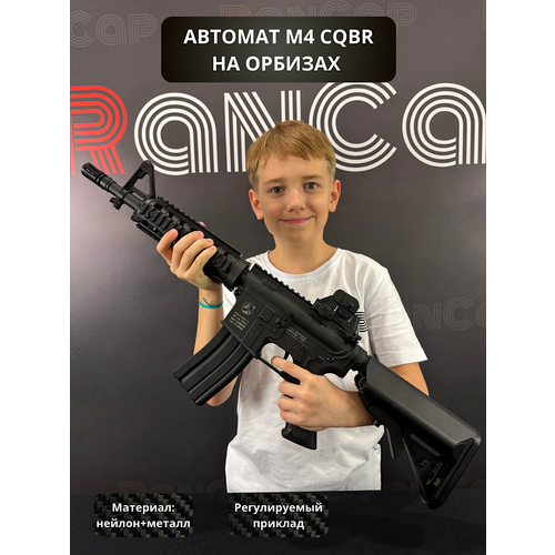 M4 CQBR на орбизах — орбибольный автомат точная копия реального M4 CQBR. Прочный нейлоновый корпус и металлические детали (шестерни гирбокса, трубка ствола, ряд переключателей, выбрасыватель магазина) делают штурмовую винтовку с орбизами увесистой и надёжной. Гравировка на корпусе добавляет аутентичности.