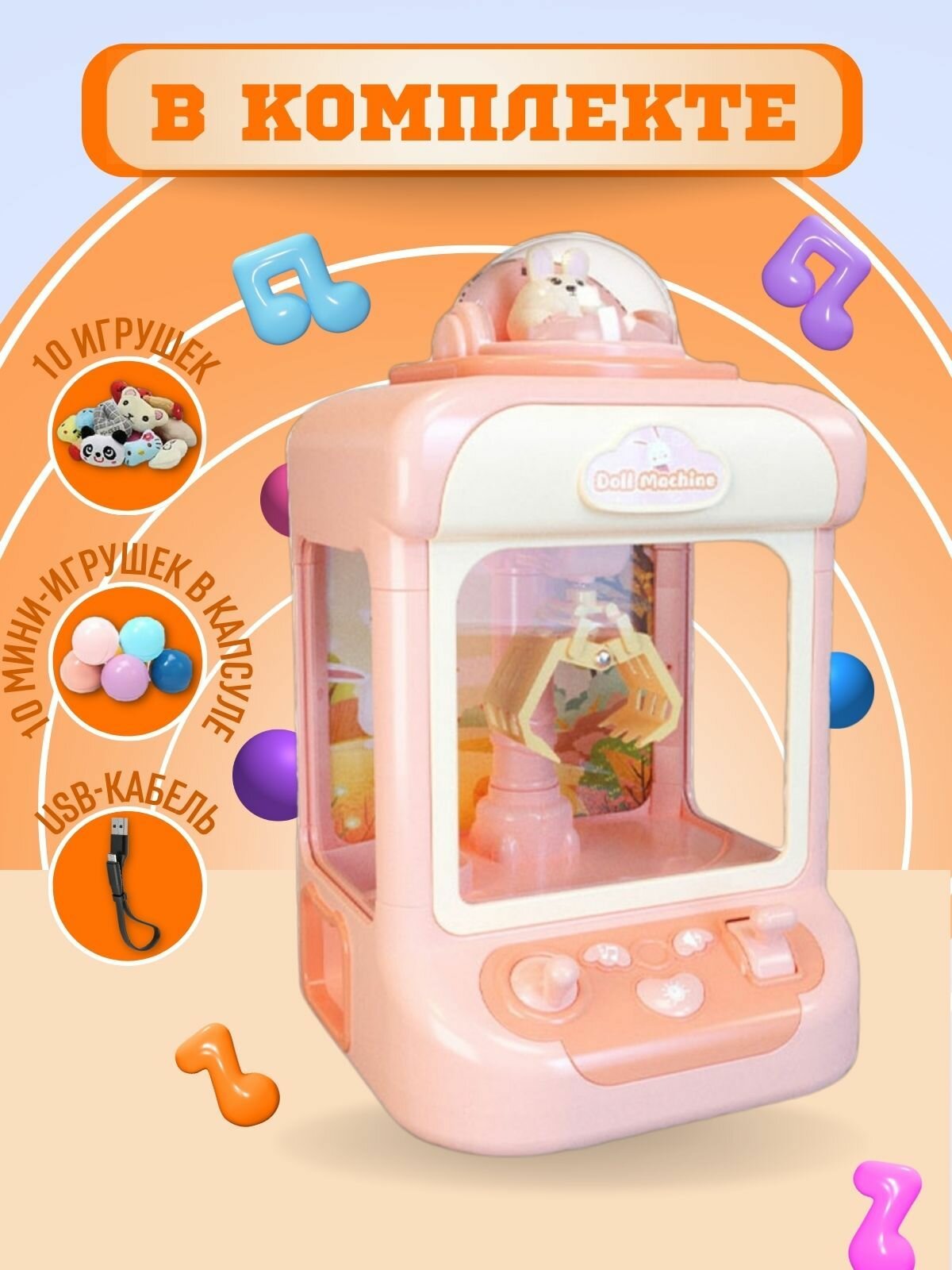 Автомат с игрушками Doll Machine сопровождает игру веселой музыкой, во время которой нужно успеть получить как можно больше призов. Вверху есть маленький слот, куда можно положить любые мини-игрушки и не только.
