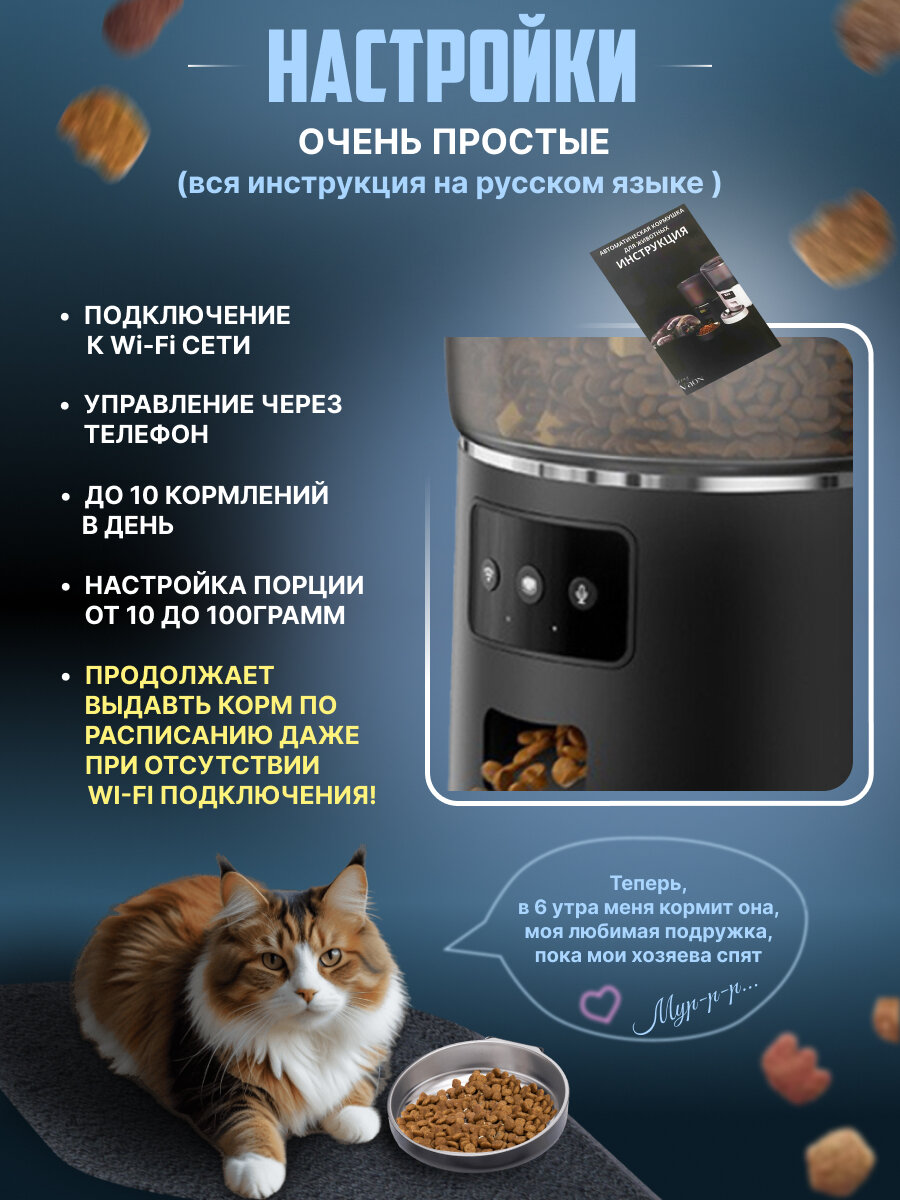 Автоматическая кормушка для кошек – это идеальный выбор для заботливых хозяев, которые хотят обеспечить своих питомцев качественным и своевременным питанием. Эта кормушка для кошек позволит настроить режим кормления животного на определенное время, что особенно удобно для занятых людей или тех, кто часто отсутствует дома. Автокормушка для кошек обеспечивает порционное кормление, что поможет избежать излишнего переедания и автоматическая кормушка предотвратит проблемы с лишним весом у вашего питомца. Кормушка для собак поможет контролировать рацион животного и кормушка для кошек автоматическая будет поддерживать здоровье. Автокормушка для собак подходит для использования как в домашних условиях, так и вне их. Автоматическая кормушка для собак легка и компактна, что делает ее удобной в транспортировке и путешествиях. Также кормушка для кота легко моется и обслуживается, что экономит ваше время и авто кормушка для кошек упростит уход. Умная кормушка для кошек - лучшее современное приобретение! Не откладывайте заботу о вашем питомце на потом – покупайте! И кормушка автоматическая для кошек, и кормушка для собак автоматическая обеспечит вашего любимца всем необходимым!