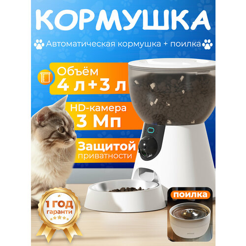 Удалённое управление: Подключение к Wi-Fi 2.4 ГГц, полное управление с телефона Двусторонняя аудиосвязь: Вы можете слышать питомца и говорить с ним Функция видеозаписи: Автоматическая запись видео при движении или по расписанию Двойная фильтрация воды: Чистая вода без запаха, шерсти и осадка Объём 4л + 3л: Подходит для кошек и собак при отсутствии хозяина
