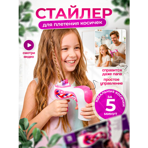 Стайлер для плетения косичек - отличный подарок для каждой модницы! Набор для плетения косичек позволит каждой девочке создать свой собственный неповторимый образ в считанные минуты и стать самой яркой среди своих подруг! Машинка для плетения косичек подойдет на любой праздник: подарок на 8 марта, подарок на день рождения, подарок на именины, подарок на Новый год. Машинка для плетения косичек упакована в красивую коробку, в комплект входит: машинка для плетения косичек, крючки для прядей, разделитель для волос, фиксатор для разделителя, набор резинок, набор клипс, расческа. Встроенный датчик предотвращает запутывание волос, не повреждает волосы, безопасен в использовании. Машинка для плетения косичек удобна и практична в использовании: просто отделите пряди разделителем, зафиксируйте волосы на разделителе, вставьте пряди в крючки для волос, проденьте крючки с прядями в трубки снизу, вытяните трубки, включите прибор и он автоматически заплетет косичку, завяжите косичку резинкой и защелкните клипсой. Готово! Неповторимый образ готов! Быстро, просто и красиво! Любая девочка будет очень рада такому мультистайлеру для плетения косичек! Стайлер работает от 3 батареек ААА (в комплект не входят).