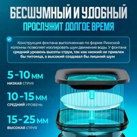 Фонтан оснащен беспородным мотором, который обеспечивает бесшумную работу на уровне ниже 30 дБ. Это позволяет использовать его даже в ночное время, не беспокоя сон вашего питомца.