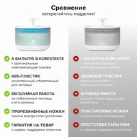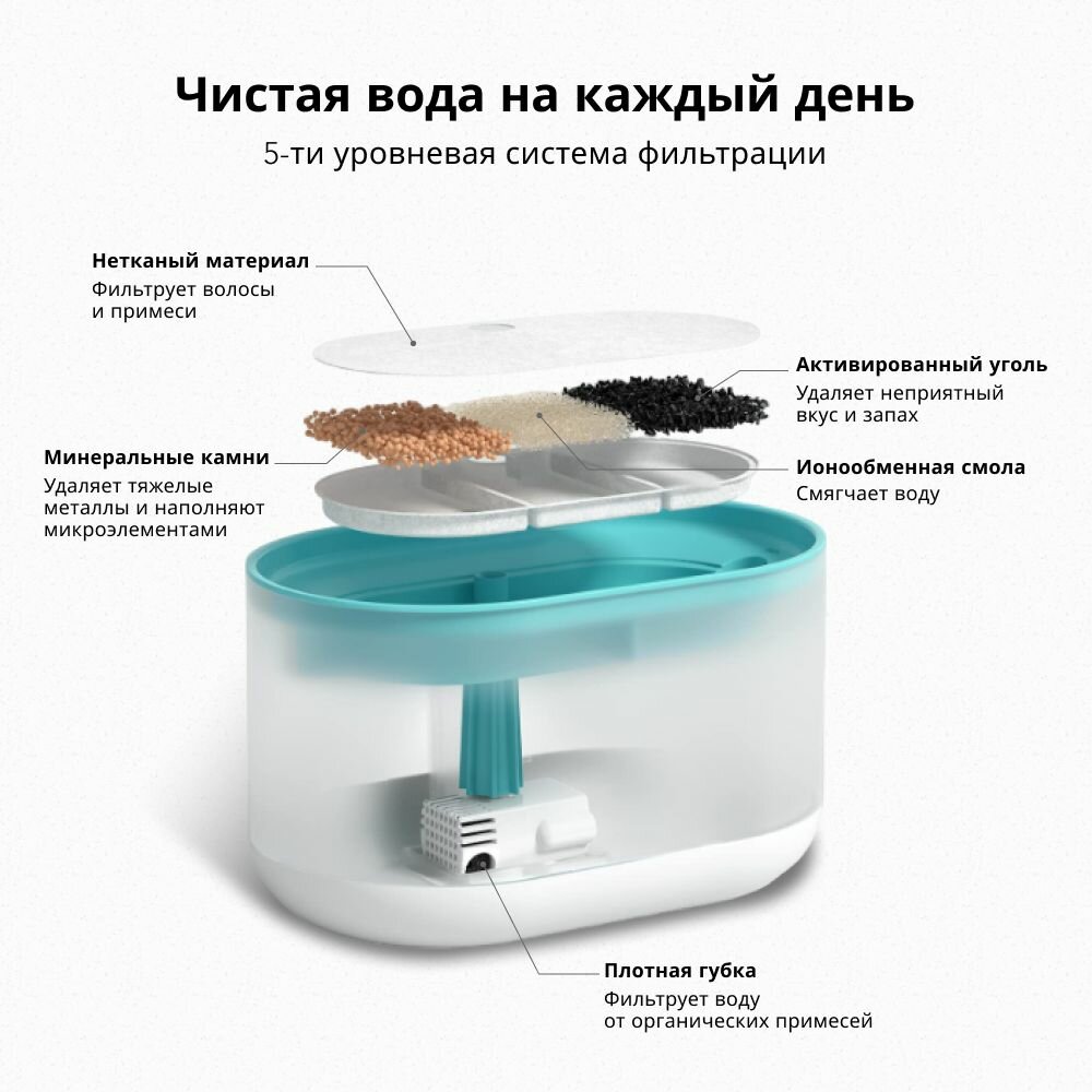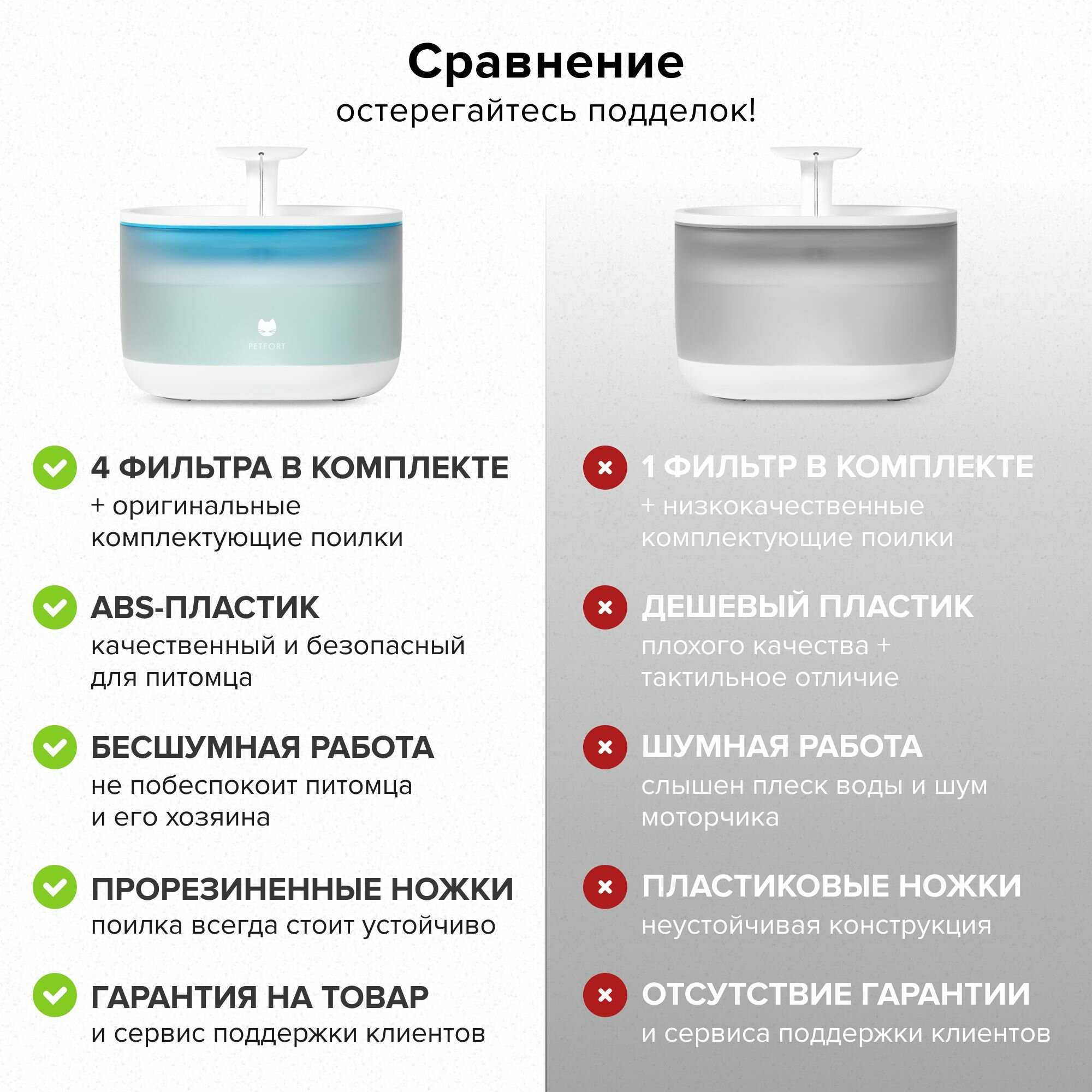 Автоматическая поилка-фонтан бренда PETFORT – это прекрасная возможность обеспечить домашних питомцев регулярной подачей чистой питьевой проточной водой. Это очень важный момент, ведь кошки инстинктивно не признают стоячую воду и на воле обычно пьют только проточную, которая защищает их от различных заболеваний, включая мочекаменную болезнь. Наша автопоилка имеет 5-ти уровневую систему фильтрации (активированный уголь, ионообменная смола и минеральные камни) и обеспечивает вашего питомца всеми необходимыми макро и микроэлементами. Поилка фонтанчик очень красивая, стильная и практичная, поэтому без труда впишется в любой интерьер. Самый главный элемент, прозрачный резервуар, позволяет всегда отслеживать уровень воды и обеспечивать своевременное пополнение поилки, чтобы питомец никогда не испытывал жажду. Объем миски 2.1 литра – оптимальный вариант для котят и щенков, а также для взрослых котов, собак, грызунов и других домашних животных. В наличии также всегда есть сменные фильтры, их можно заказать в любой момент, как и другие зоотовары, с которыми вы можете ознакомиться в нашем магазине. Успейте купить качественную автоматическую поилку для Вашего питомца, ведь забота о его здоровье – это лучшее проявление Вашей любви!