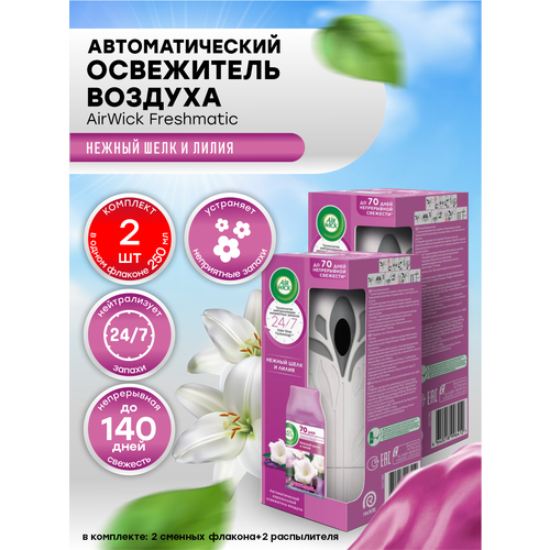 Купить Автоматический освежитель воздуха Air Wick со сменным баллоном Нежный шелк и лилия х 2 шт. с доставкой по всей России. Автоматический освежитель воздуха Air Wick со сменным баллоном Нежный шелк и лилия х 2 шт.: сравнение цен, характеристики, фото, актуальное наличие и цены.