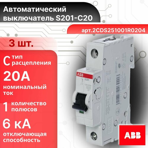 Автоматический выключатель 1P (1П) 20А тип C 6кА S201 ABB 2CDS251001R0204 3шт: сравнение цен, характеристики, фото, актуальное наличие и цены.